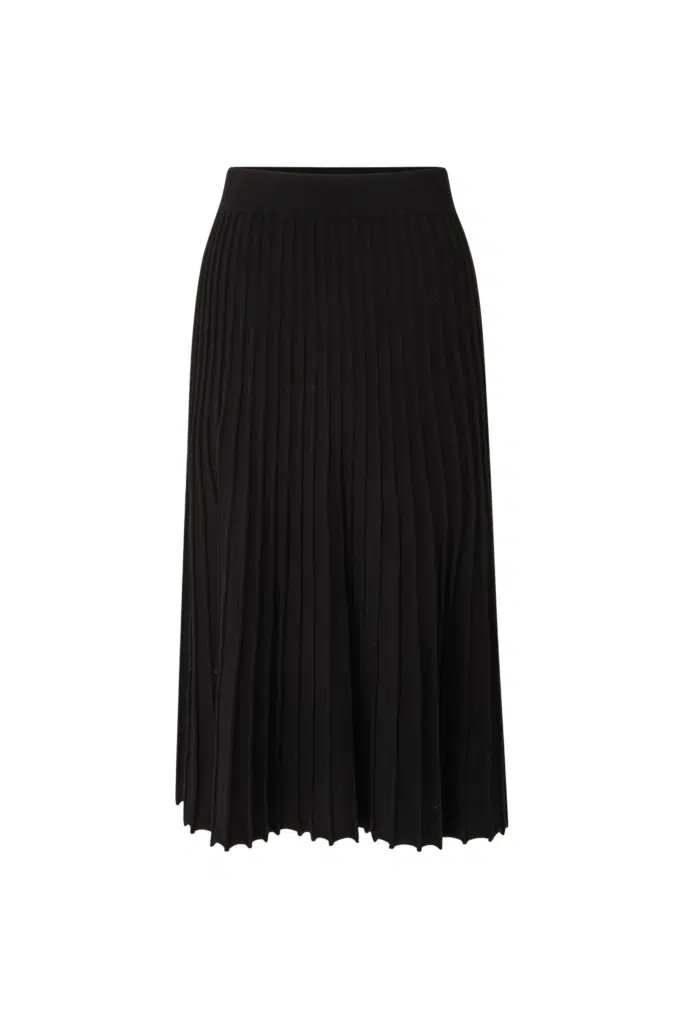 Bekväm kjol i svart, stickad kvalitet med mjukt resårband i midjan. Kjolen är mönsterstickad med graderade ränder, och kan upplevas som veckad nertill. Den totala längden i storlek S är 76 cm.