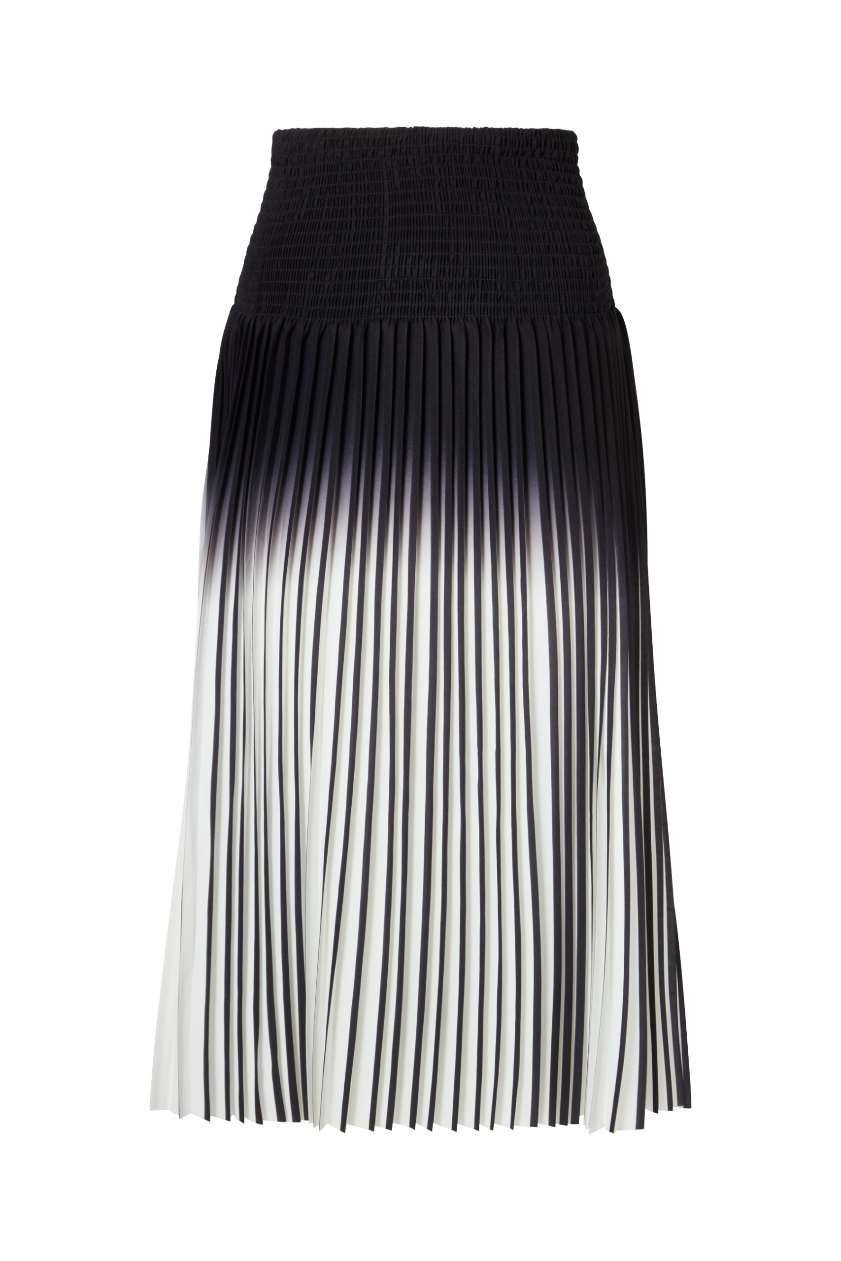 Stretchig kjol med randig och bubblig struktur och viss glans. Resår i midjan och våder med ränder som ligger åt olika håll. Kjolen har infällda partier nertill för extra vidd och är fodrad i ett stretchigt foder. Längden i storlek S är 77 cm.