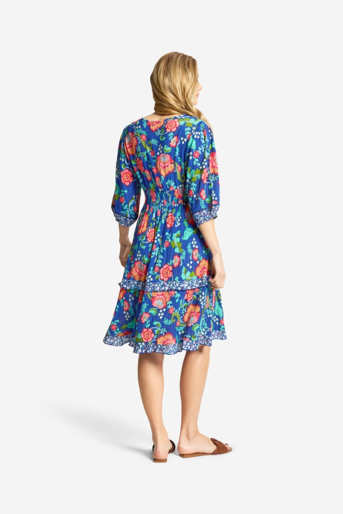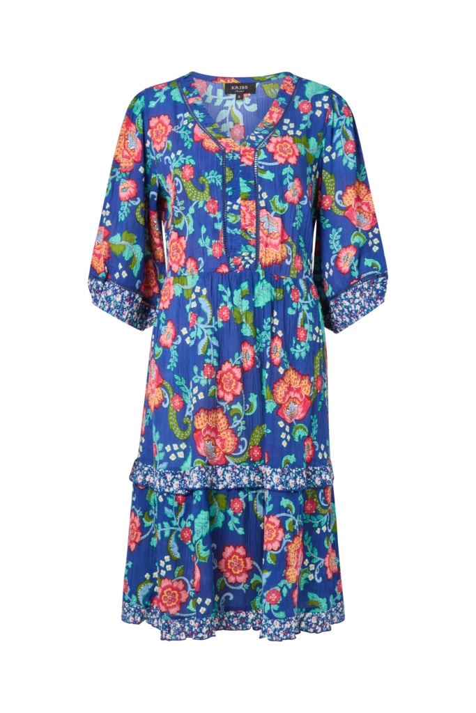 Somrig klänning i crepe viskos med blommigt print i blått och rosa. Klänningen har en V-formad halsringning med ett rynkat kantband ihop med en vacker hålspets, som fortsätter vidare ner över byst och slutar vid avskärningen i midjan. Det finns ett smockparti vid midjan baktill. Modellen har två horisontella våder à la singoalla med rynk och en liten volang i ett småmönstrat print vid sömmen och även i nederkanten. Halvlång ballongärm med en bård av småmönstrat tyg och resår nertill. Den totala längden i storlek S är 101 cm från den högsta punkten.