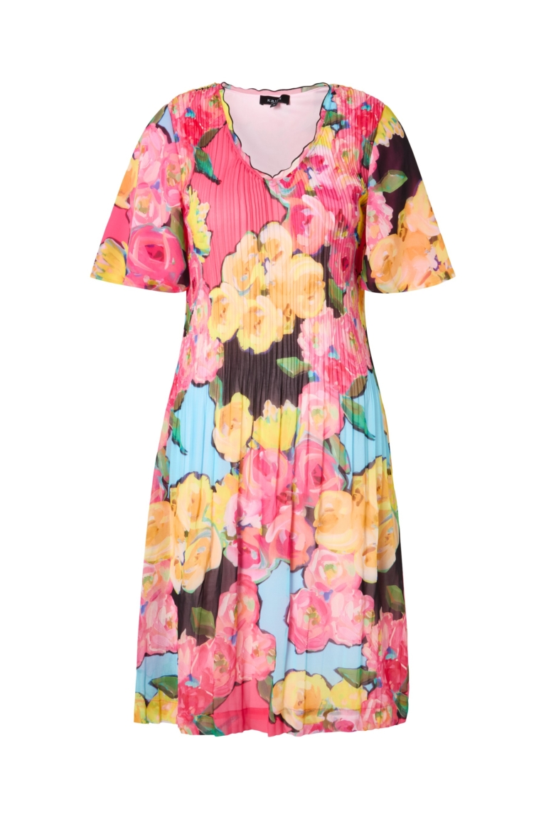 Sommarklänning med print i återvunnen polyester chiffong. Modellen är plisserad och något åtsittande i midjan och blir sedan utstruken över höften vidare till nederkanten. V-ringad halsringning med en slät volang som går ut och täcker axeln som en liten ärm. Klänningen är helfodrad och har en knapp och ett V-sprund baktill. Den totala längden i storlek S är 105 cm från den högsta punkten.