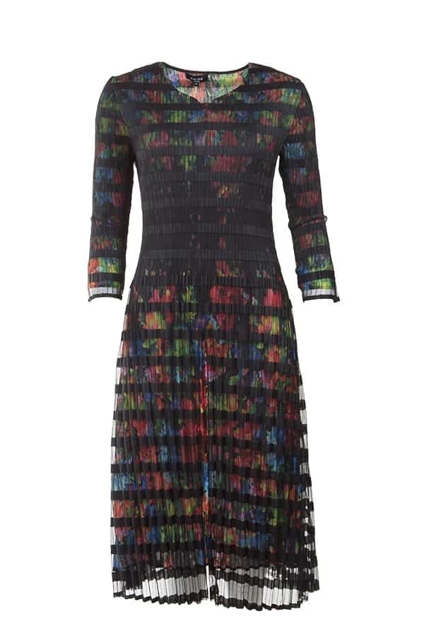 Fantastisk vacker klänning i två lager. Undre lagret är plisserad, printad chiffong och övre lagret är plisserad svart mesh med tvärgående ränder. 3/4 lång ärm som är utstruken nedtill och totallängden på klänningen är 118 cm i storlek S. Passa perfekt till höstens fester!