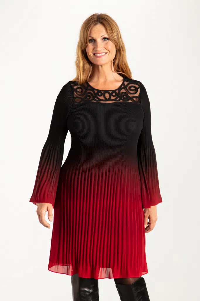 Vacker klänning i återvunnen polyester med mycket mjuk känsla i tyget. Genombrutet ok med svarta banddetaljer framtill. Modellen har ett graderat "dipdye" print i svart och rött och en tät plissering upptill samt något insvängd midja och utstruken kjoldel. Lång ärm som även den är utstruken och vid på undre delen. Klänningen har ett stretchigt foder och rund halsringning med en slits och knapp baktill. Totallängden i storlek S är 96 cm.