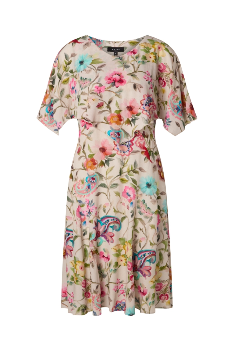 Klänning med en fantastisk passform som klär många olika kroppstyper. Den åtsittande underklänningen tillsammans med de skira diagonala våderna med laskade avslut ton i ton, gör underverk för figuren. Rund, ej så djup halsringning, genombruten kort ärm med lite vidd.