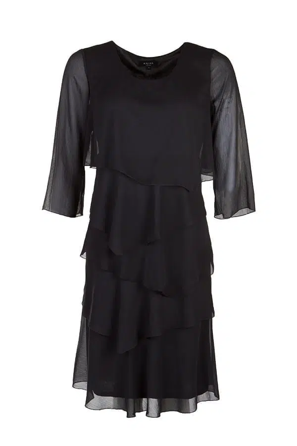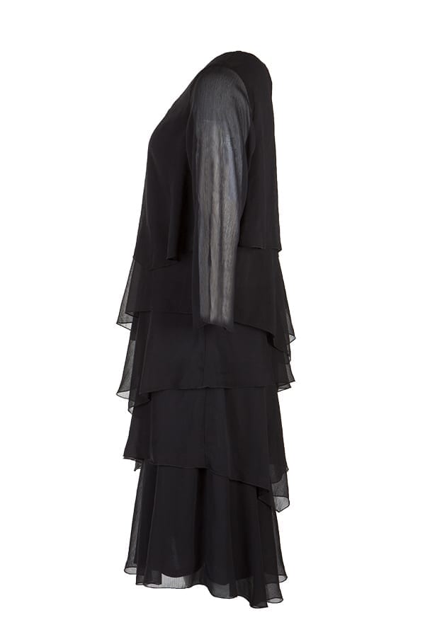 Klänning i en fantastisk passform som klär de flesta figurer. De skira våderna med laskade avslut ligger på diagonalen och faller fint. Klänningen är helfordrad i kroppen och har 3/4-lång, något vid ärm.