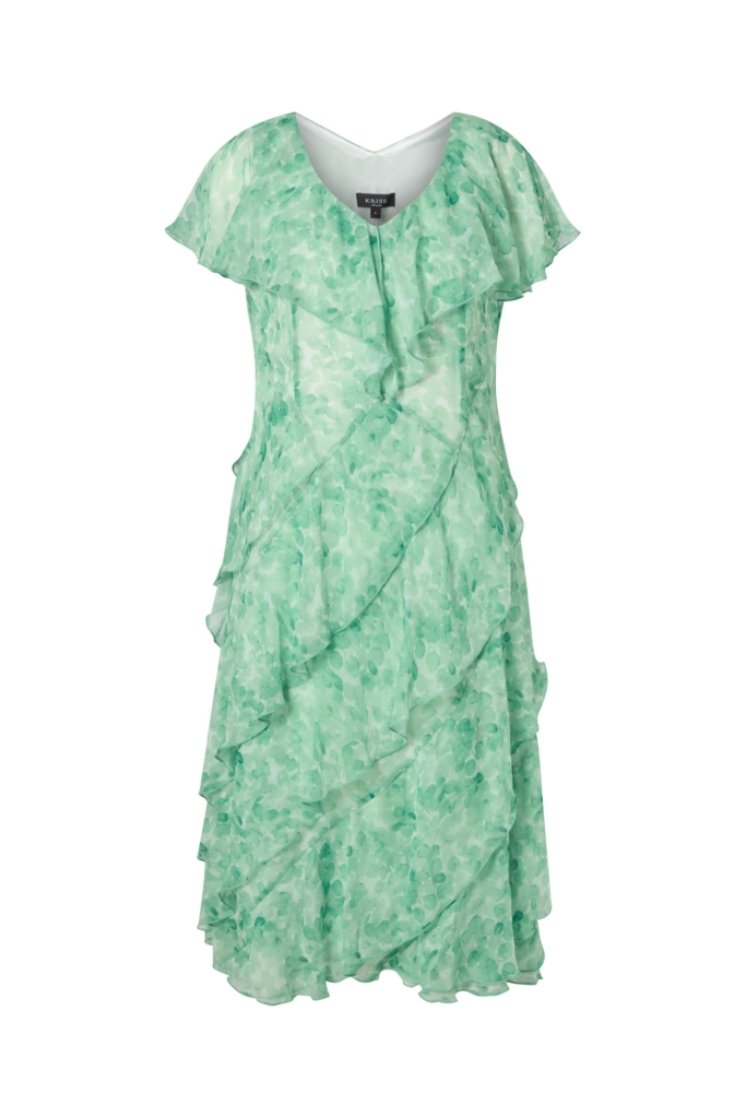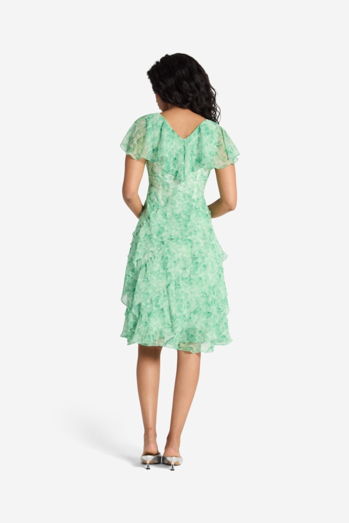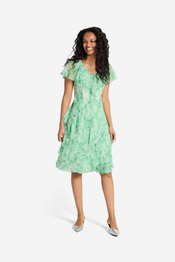 Vacker klänning med småmönstrat print i skir chiffong. Modellen är något åtsittande i midjan och därifrån går sedan de diagonala volangerna ner över höften och fortsatt till den vidare nederkanten. V-ringad halsringning med en dekorativ volang som går ut och täcker axeln. Klänningen är helfodrad och den totala längden i storlek S är 105 cm från den högsta punkten.