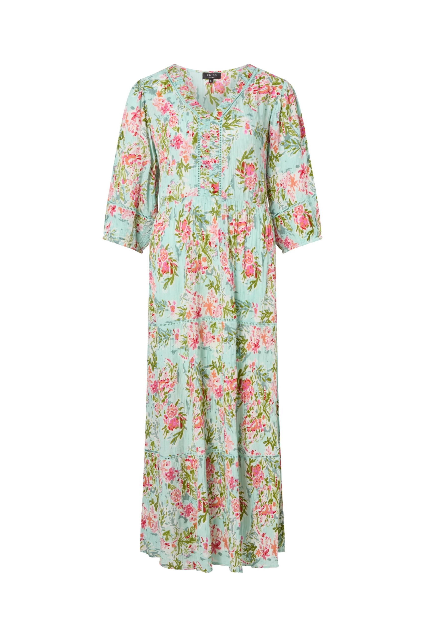 Vacker sommarklänning i ljuvligt blommönster på offwhite botten i chiffong. Modellen är något åtsittande i midjan och därifrån går sedan de diagonala volangerna ner över höften och fortsatt till den vidare nederkanten. V-ringad halsringning med en dekorativ volang som går ut och täcker axeln. Klänningen är helfodrad och den totala längden i storlek S är 105 cm från den högsta punkten.