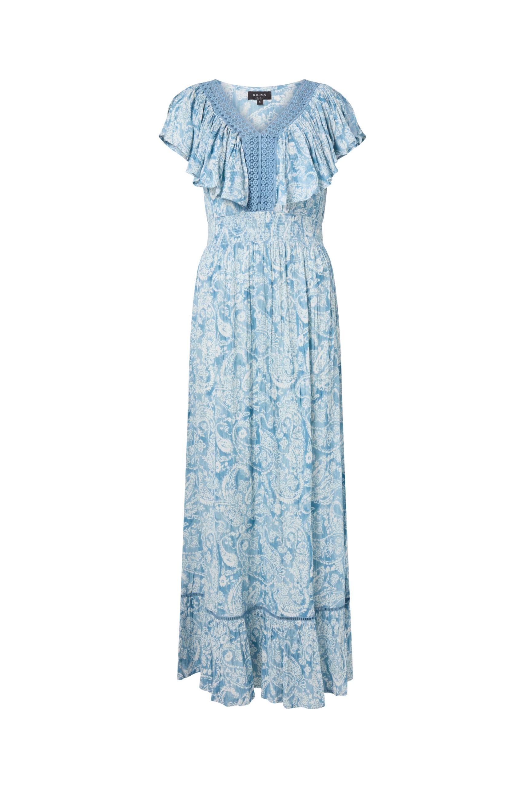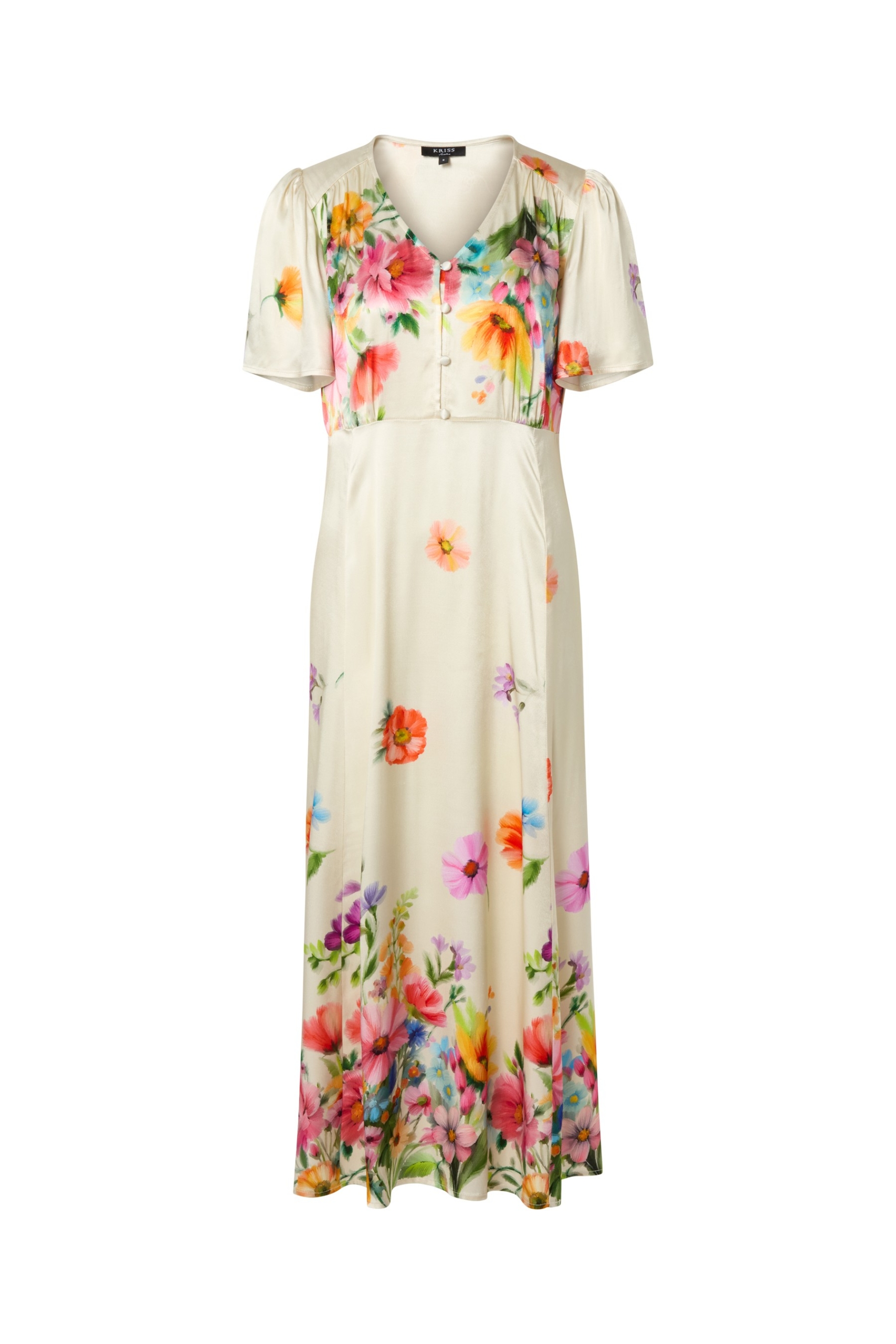 Härlig klänning med blommönster i marin och offwhite chiffong. Modellen är något åtsittande i midjan och därifrån går sedan de diagonala volangerna ner över höften och fortsatt till den vidare nederkanten. V-ringad halsringning med en dekorativ volang som går ut och täcker axeln. Klänningen är helfodrad och den totala längden i storlek S är 105 cm från den högsta punkten.