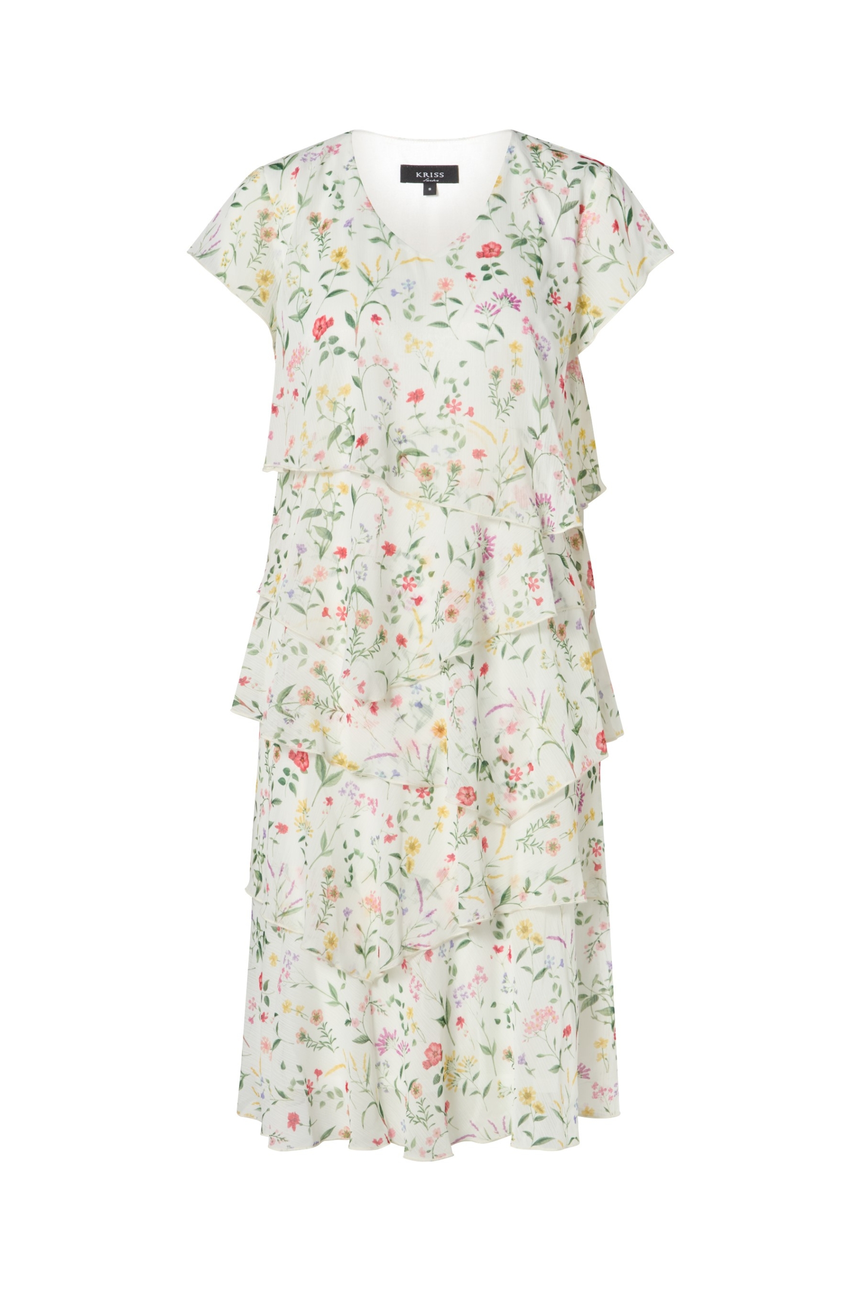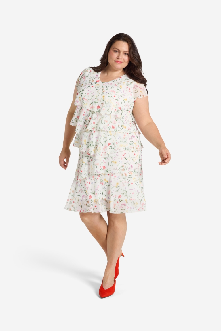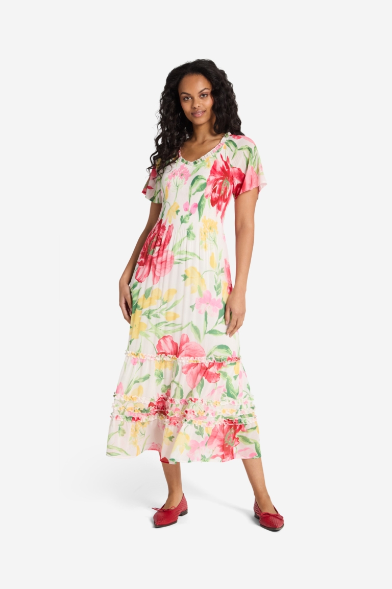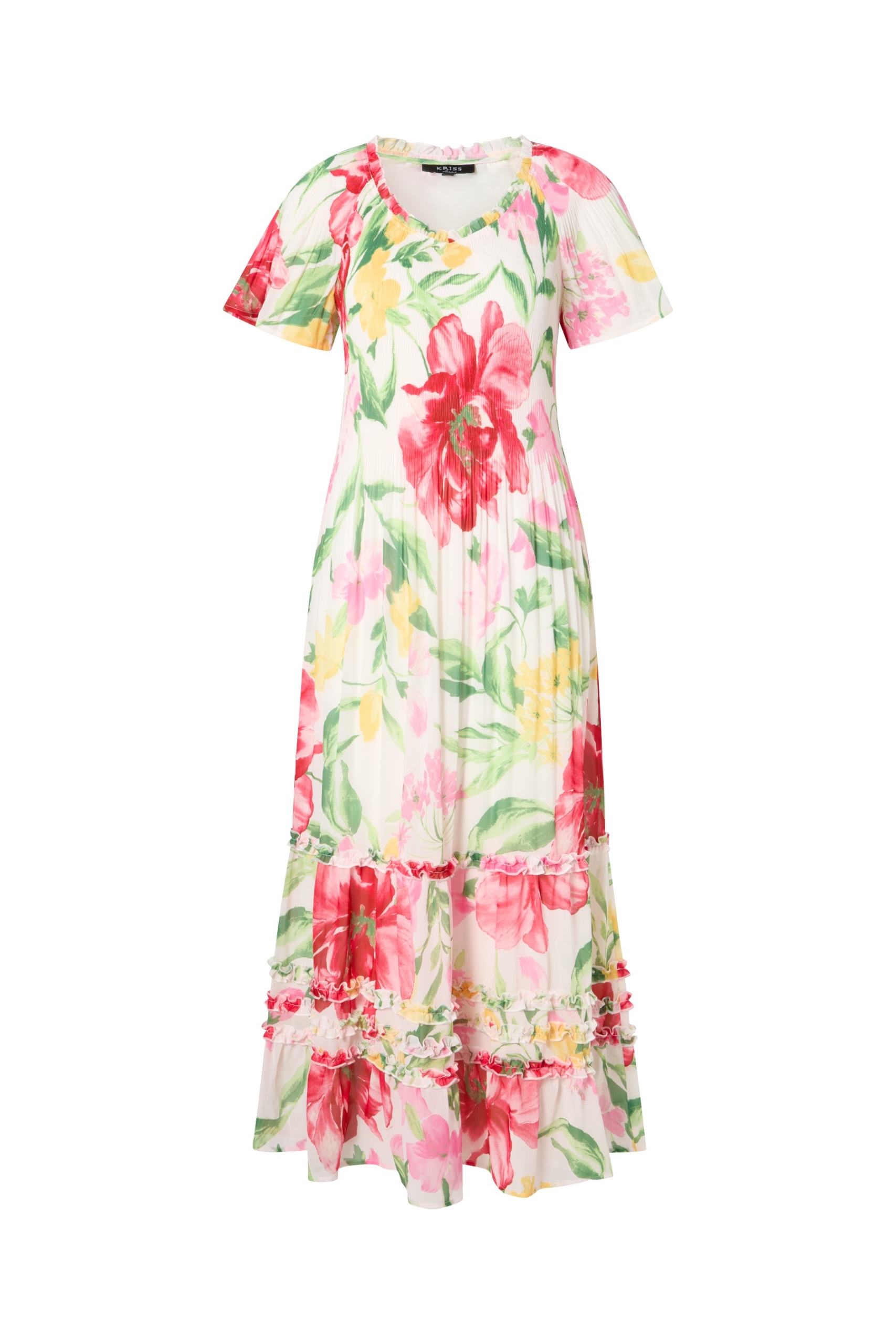 Vacker klänning i skön crepe viskos med prickar på brun botten. V-formad halsringning och omlott med ett hålmönstrat band i kanten. Avskärning under byst med en bred smockdel runt midjan både fram och bak. Klänningen är ärmlös och har det hålmönstrade bandet vid ärm öppningen. Bandet finns även vertikalt på kjoldelen samt diagonalt över den avslutande volangen nertill. Den totala längden i storlek S är 133 cm från den högsta punkten.