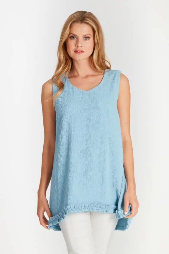 Generöst linne i skön viskosblandning med snygg struktur och viss stretch i tyget. Modellen är något A-linje formad i passformen och avslutas med en ojämn, rundad nederkant med en frill i avslutet. Linnet har breda axelband, rund halsringning och bystinsnitt. Den totala längden i storlek S är 76 cm från den högsta punkten. Matchar fint med Jacka Zoe i samma serie.