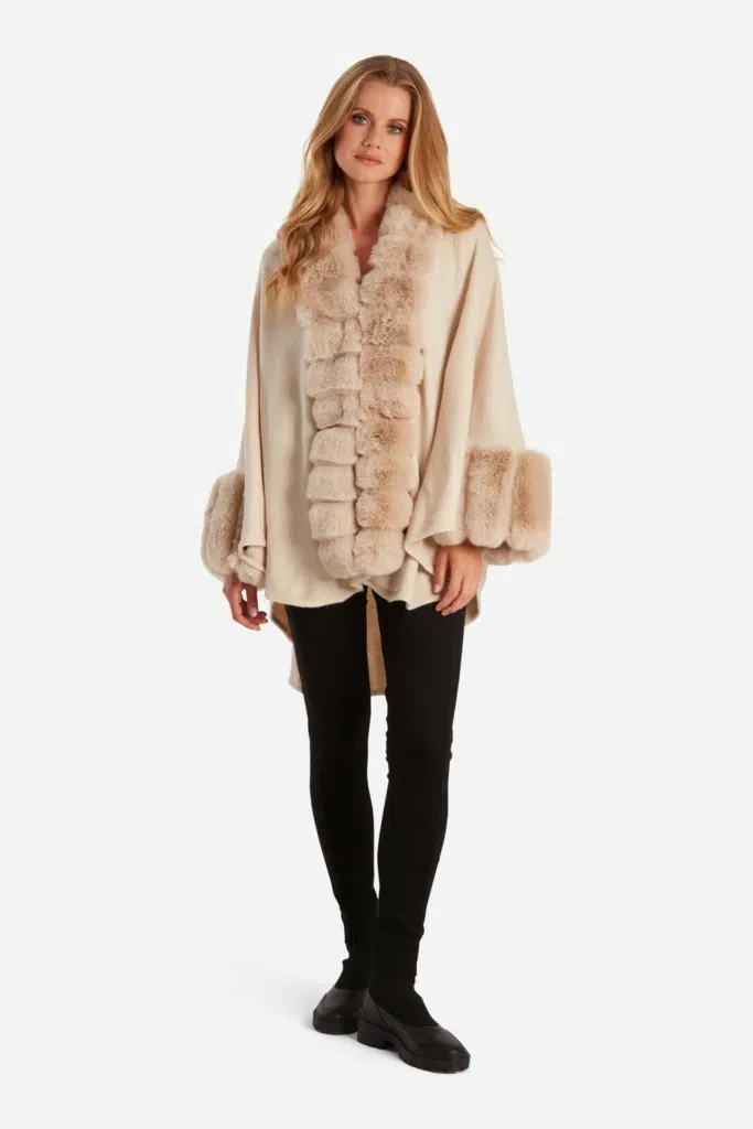 Flatstickad poncho med härliga fuskpälsdetaljer, -beige