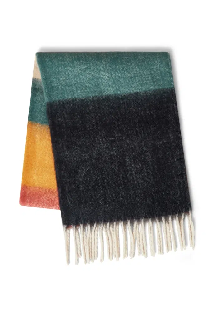 Stickad scarf med luddig känsla och tydliga färgpartier. Kortsidorna har tvinnade, ljusa fransar.