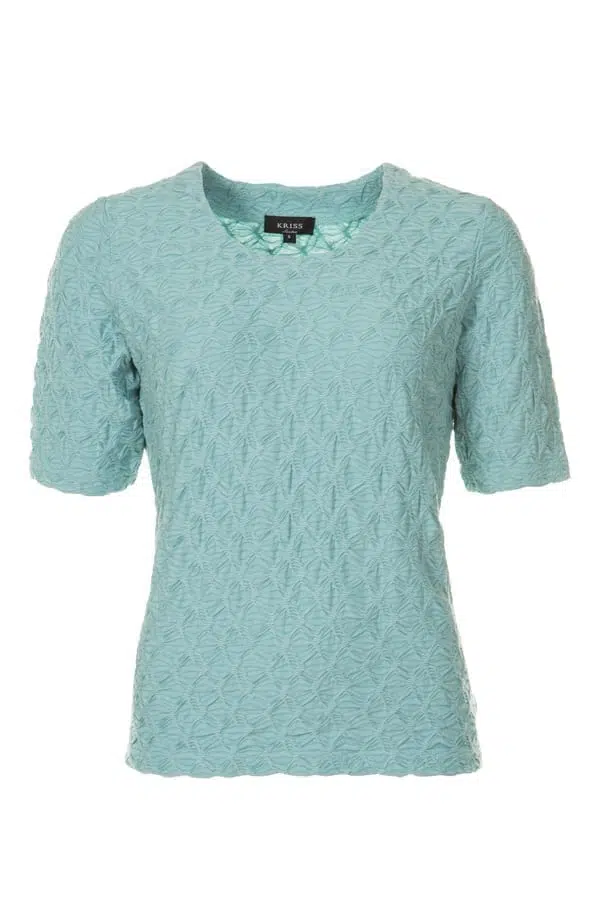 Denna topp som presenteras i fyra underbara pasteller samt svart är en kombination av tidigare omtyckta toppar. Strukturen i tyget ger toppen en exklusiv känsla samtidigt som den är mjuk och skön att bära. Den svagt rundade halsriningen har ett brett nervik som ger stadga i all sin enkelhet. Ärmen är kort men tillräckligt lång för att gå ner och dölja det som många vill dölja när man vill känna sig klädd i en kortärmstopp. Toppen är något insvängd i modellen.