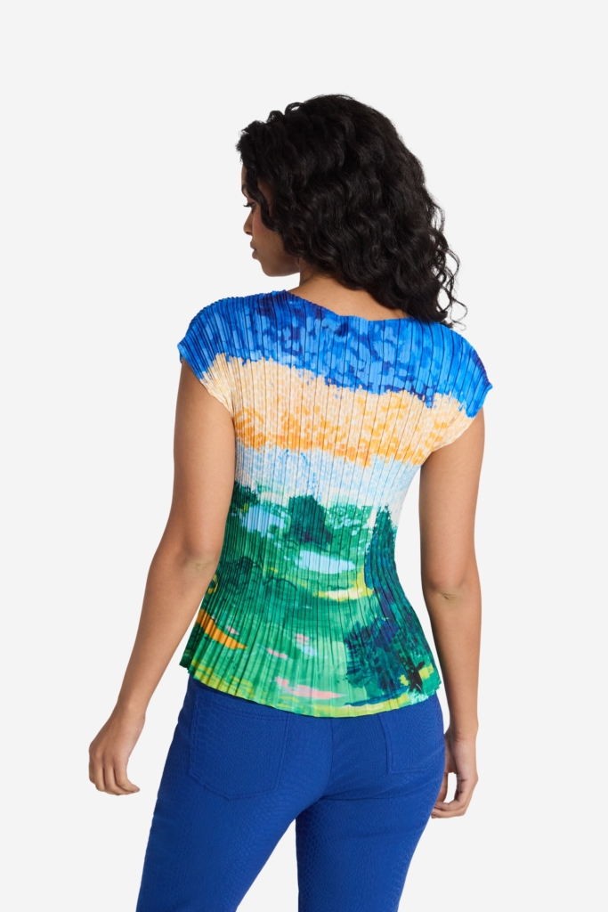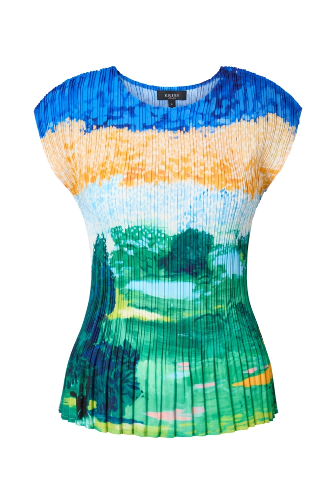 Plisserad topp med smidig kvalitet och placerat print på en matt botten. Svagt V-ringad halsringning och en liten holkärm som täcker axeln. Modellen är helplisserad och lättburen. Den totala längden i storlek S är 60 cm från den högsta punkten. Modellen på bilden är 178 cm lång och bär storlek small. Våra större storlekar är normala i storleken, medan våra mindre storlekar är något mer generösa.