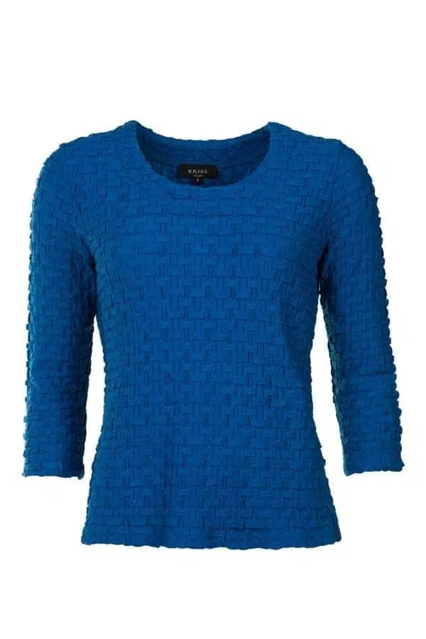Underbar topp i ett nytt material som är mjukt och följsamt. Toppens struktur ser flätad ut och ger en superläcker tredimentionell känsla. Klassisk passform med en aning insvängd midja, trekvartslång ärm och en snygg ej för djup halsringning.