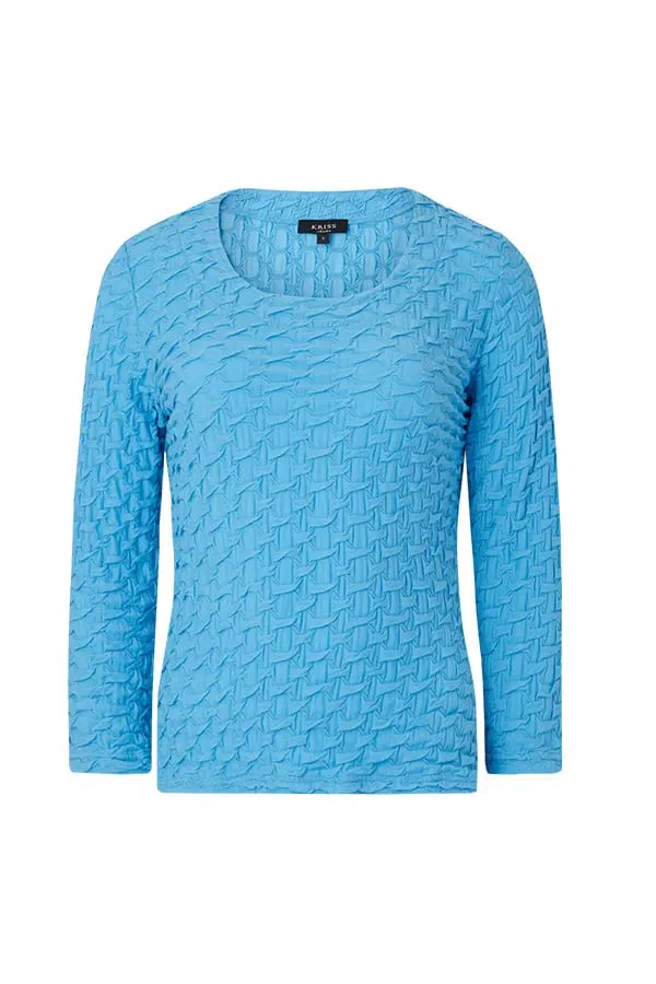Underbar topp i ett uppskattat material som är mjukt och följsamt. Strukturen ser flätad ut och ger en tredimensionell look. Klassisk passform med något insvängd midja, trekvartslång ärm och en rund halsringning. Längden i storlek S är 59 cm från högsta punkten.