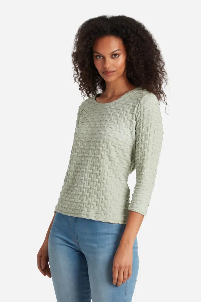 Underbar topp i ett uppskattat material som är mjukt och följsamt. Strukturen ser flätad ut och ger en tredimensionell look. Klassisk passform med något insvängd midja, trekvartslång ärm och en rund halsringning. Längden i storlek S är 59 cm från högsta punkten.