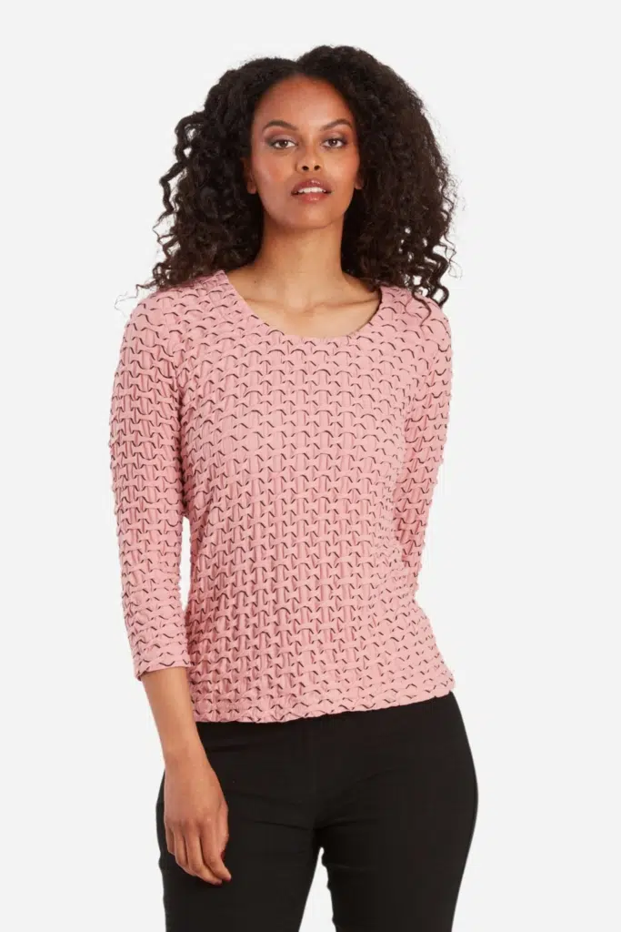 Underbar topp i ett uppskattat material som är mjukt och följsamt. Strukturen ser flätad ut och ger en tredimensionell look. Klassisk passform med något insvängd midja, trekvartslång ärm och en rund halsringning. Längden i storlek S är 59 cm från högsta punkten.