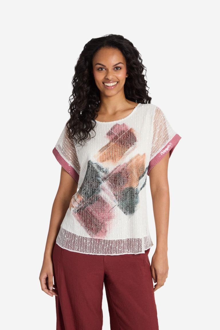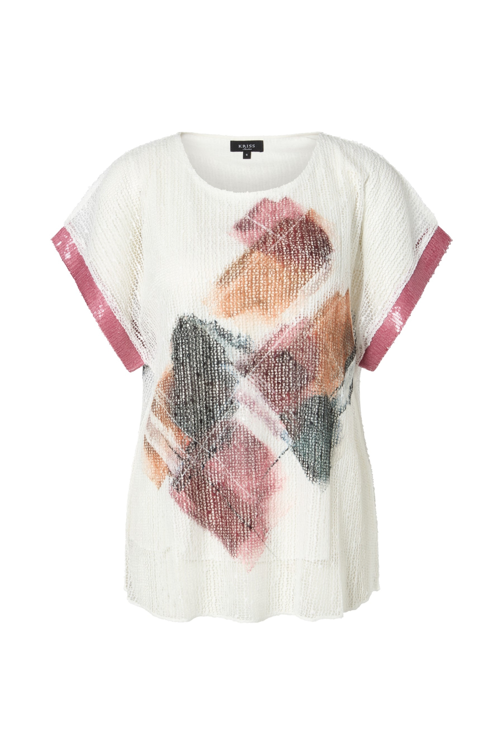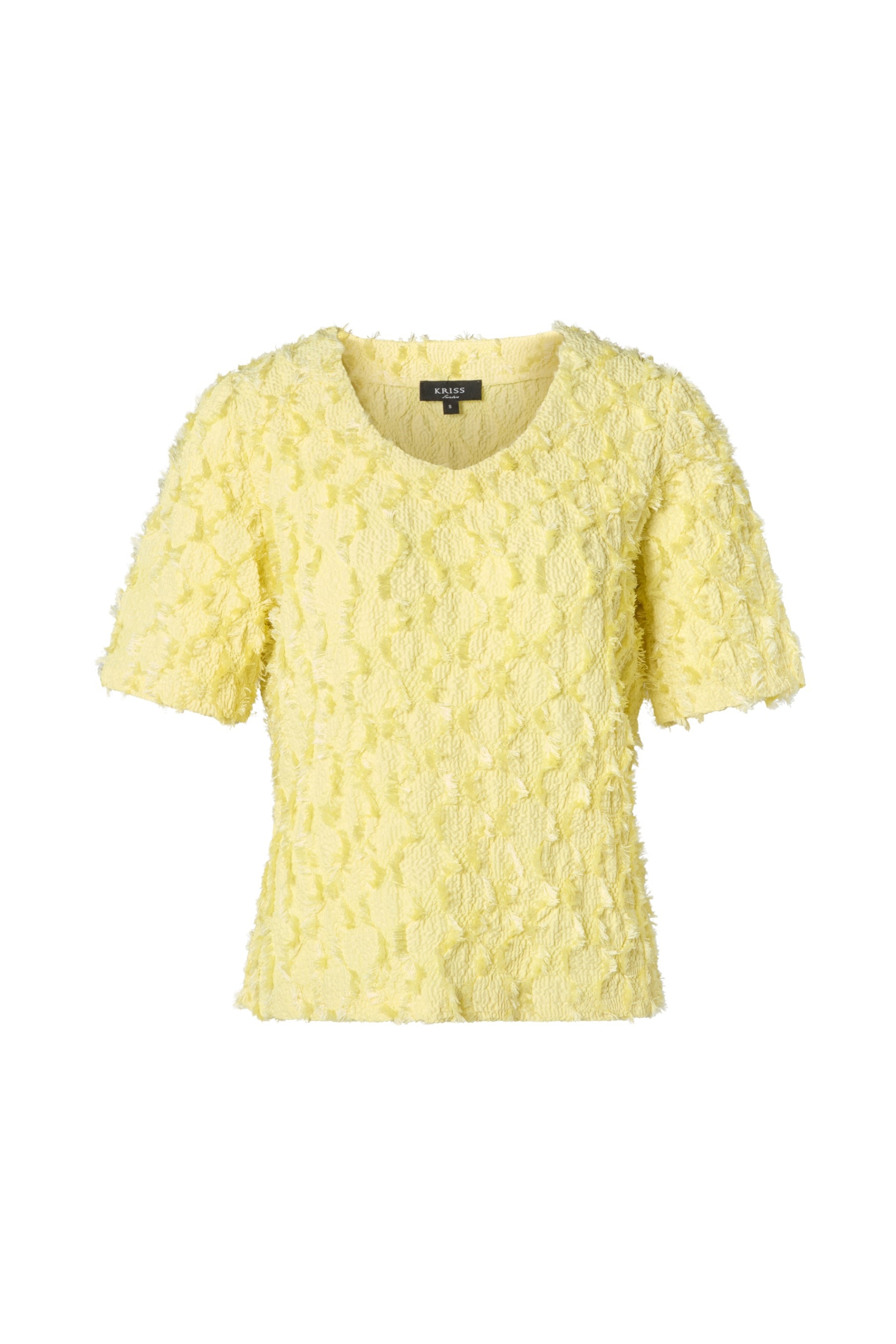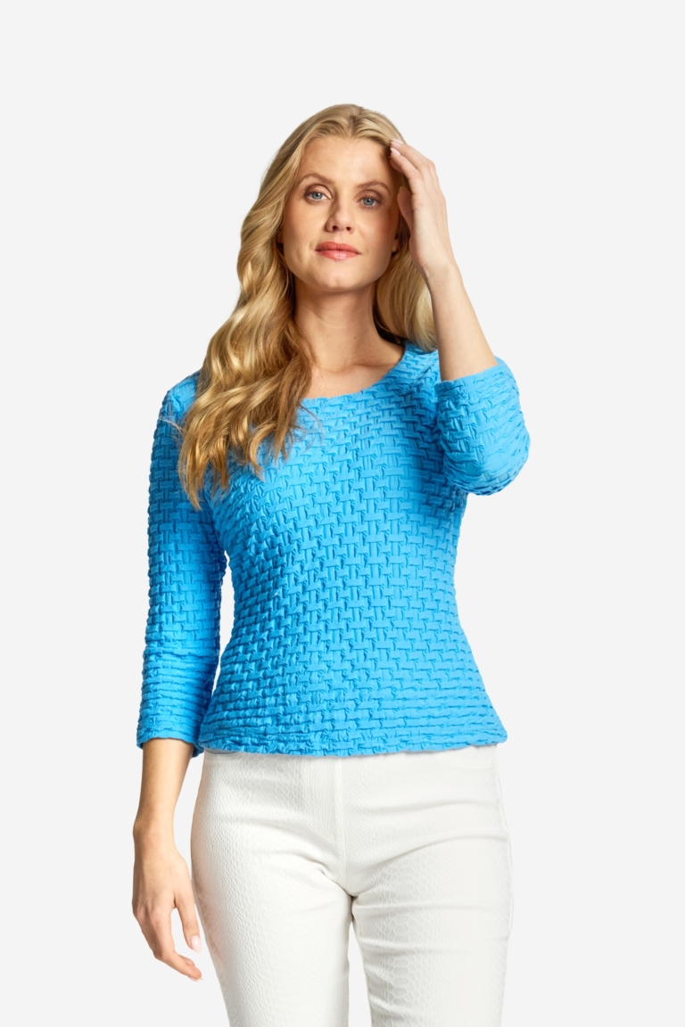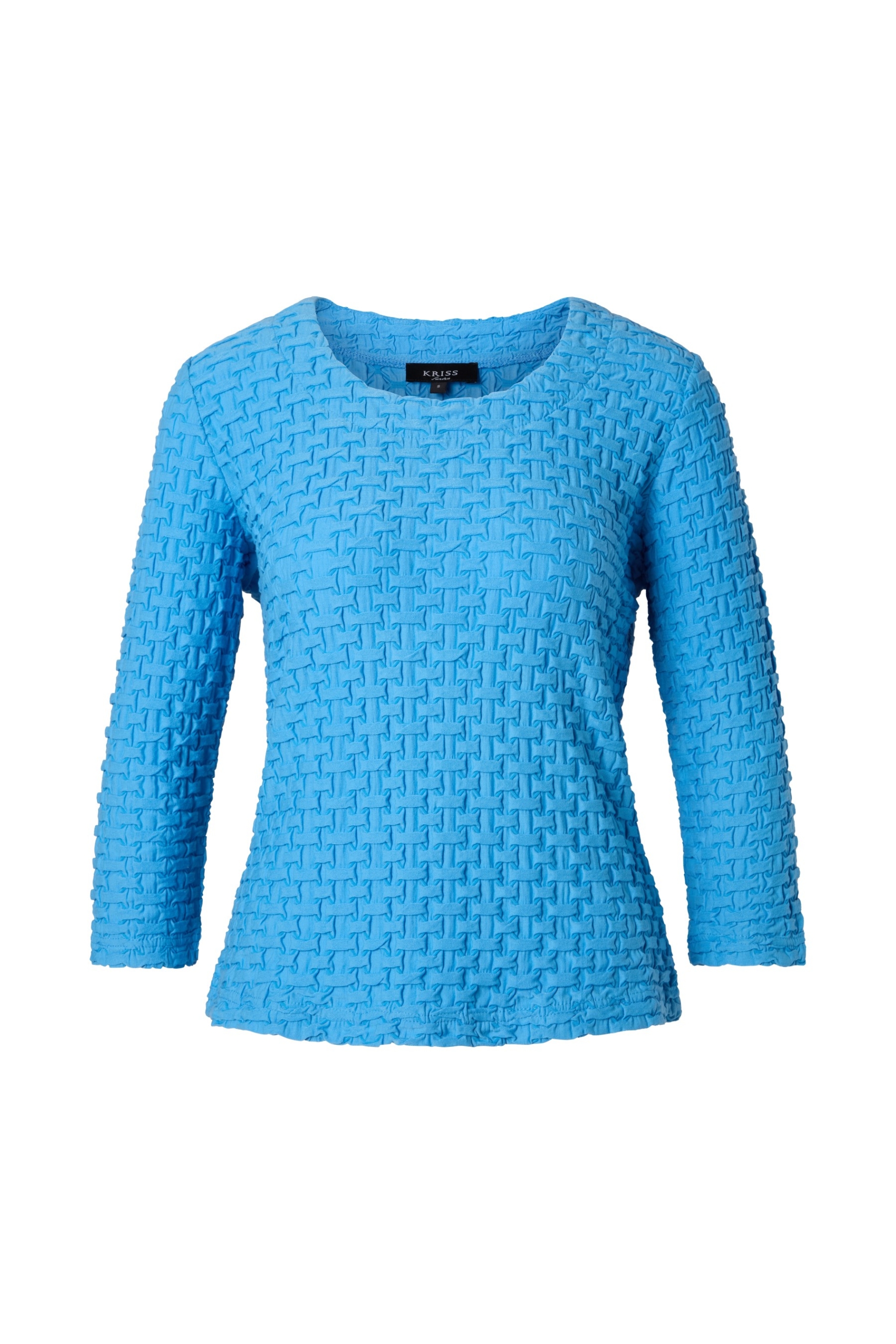 Underbar topp i ett uppskattat material som är mjukt och följsamt. Strukturen ser flätad ut och ger en tredimensionell look. Klassisk passform med något insvängd midja, trekvartslång ärm och en rund halsringning. Längden i storlek S är 59 cm från högsta punkten.