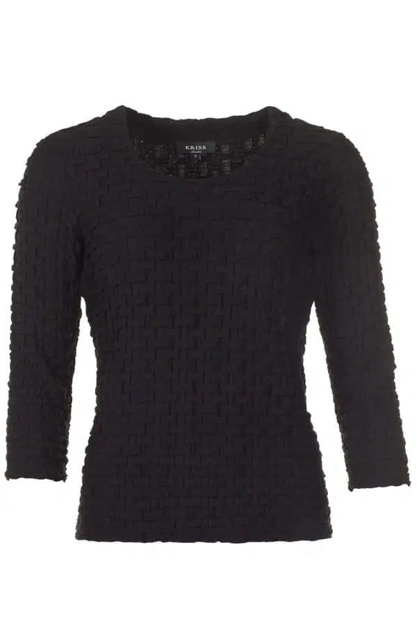 Underbar topp i ett nytt material som är mjukt och följsamt. Toppens struktur ser flätad ut och ger en superläcker tredimentionell känsla. Klassisk passform med en aning midja, trekvartslång ärm och en snygg ej för djup halsringning.