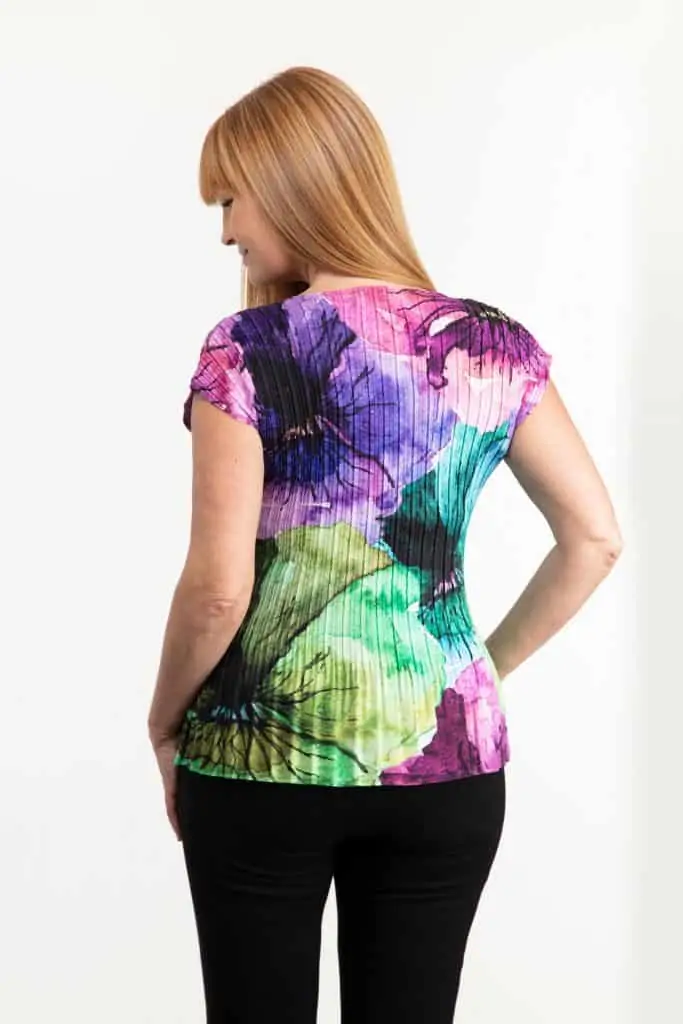Plisserad topp med smidig kvalitet och storblommigt print på en matt botten. Modellen är helplisserad och mycket lättburen, passar att bära under en kavaj eller bara precis som den är. Den har en svagt V-ringad halsringning och en liten holkärm. Den totala längden i storlek S är 62 cm från den högsta punkten.