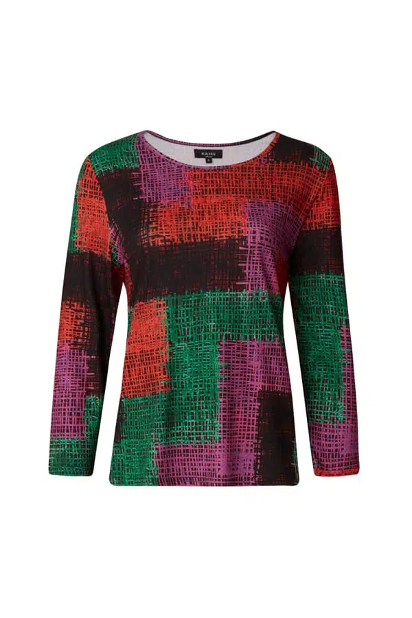 En mjuk och tunn topp i borstad trikå med vävt print i multifärg. Modellen är relativt rak i passformen och har 3/4-lång ärm. Den runda halsringningen har en dekorativ kant påsydd i samma tyg. Den totala längden i storlek S är 61 cm från den högsta punkten.