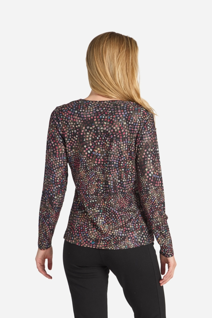 Vacker topp med småmönstrat print och guldinslag, i en smalrandig, tunn trikå med dovt silverskimmer. Rund hals med kantband och lång ärm. Modellen är något insvängd i midjan och den totala längden i storlek S är 61 cm från den högsta punkten.