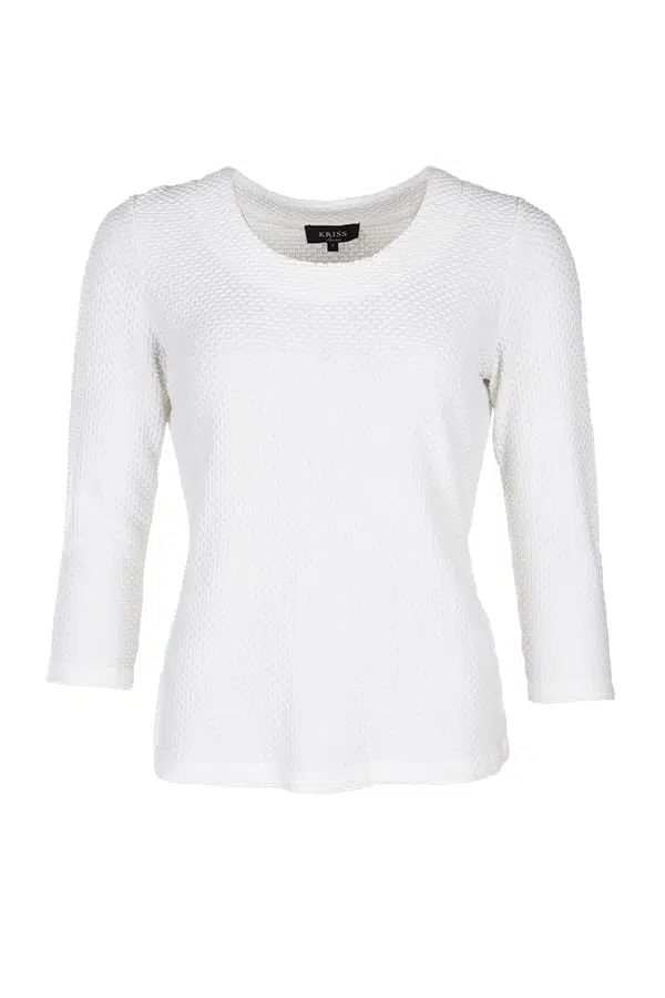 Underbar topp med struktur som är mjuk och följsam. Klassisk passform med något insvängd midja, trekvartslång ärm och en rund halsringning.