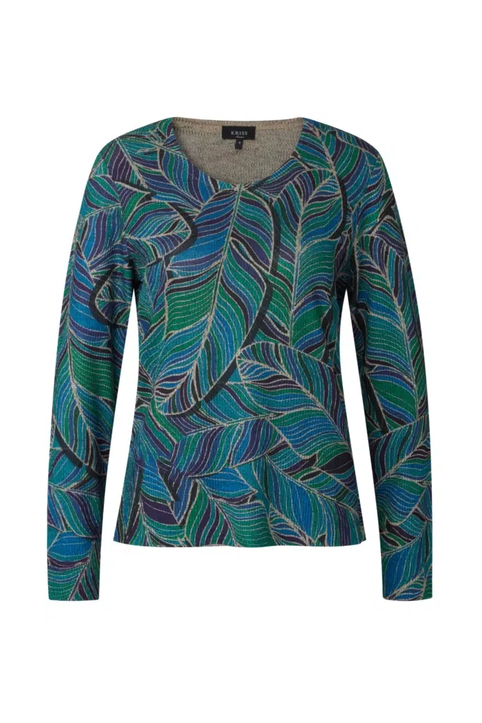 Smidig topp med lövinspirerat print och silverglans, i en smalrandig, tunn trikå med skönt fall. Rund hals med kantband och lång ärm. Modellen är något insvängd i midjan och den totala längden i storlek S är 61 cm från den högsta punkten.