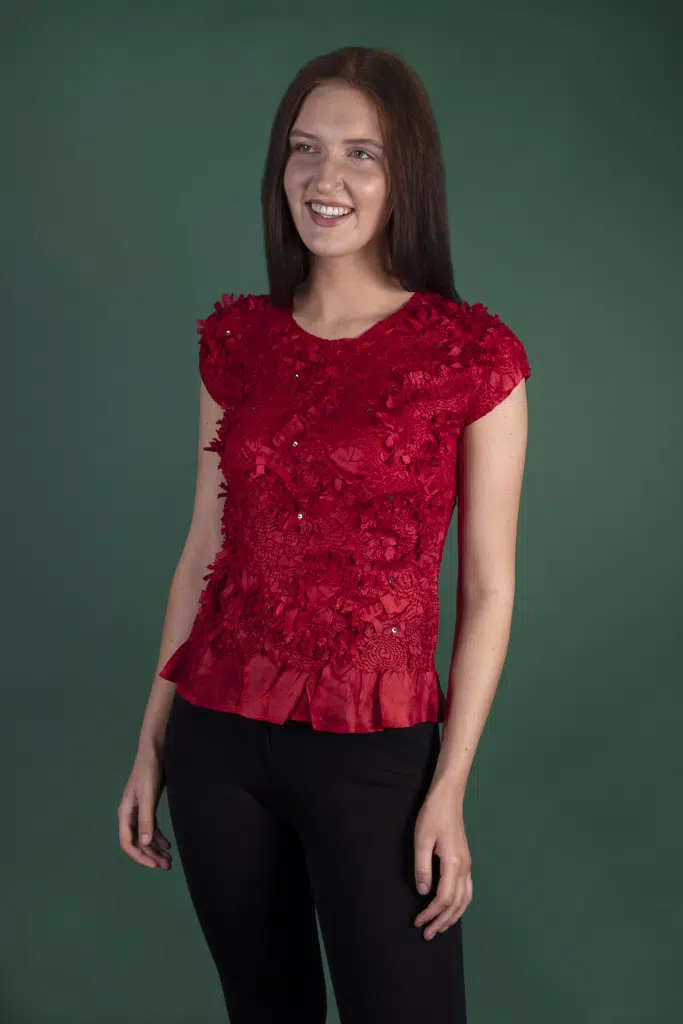 Söt plisserad topp med påsydda band och dekorations stenar framtill. Toppen är utstruken i nederkanten, och har en mjuk och glansig kvalitet som är lätt att sköta. Rund halsringning och en liten holkärm som täcker axeln. Passar fint under en kavaj/jacka eller att använda precis som den är. Enkel men med en exklusiv känsla. Den totala längden i storlek S/M är 57 cm från den högsta punkten.