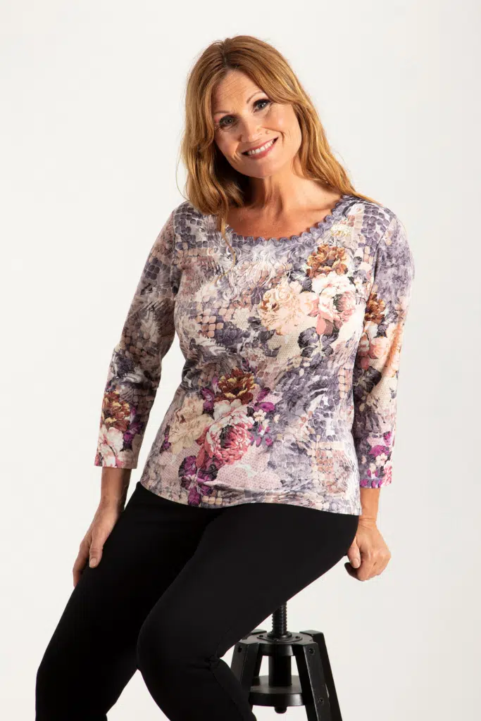 Unik topp med vackert print i stone och rosa med ok framtill och dekorationsstenar. Kvaliteten i printad burnout trikå är tunn och smidig och passformen är något insvängd i midjan. V-formad halsringning och 3/4-lång ärm. Längden i storlek S är 62 cm från högsta punkten.