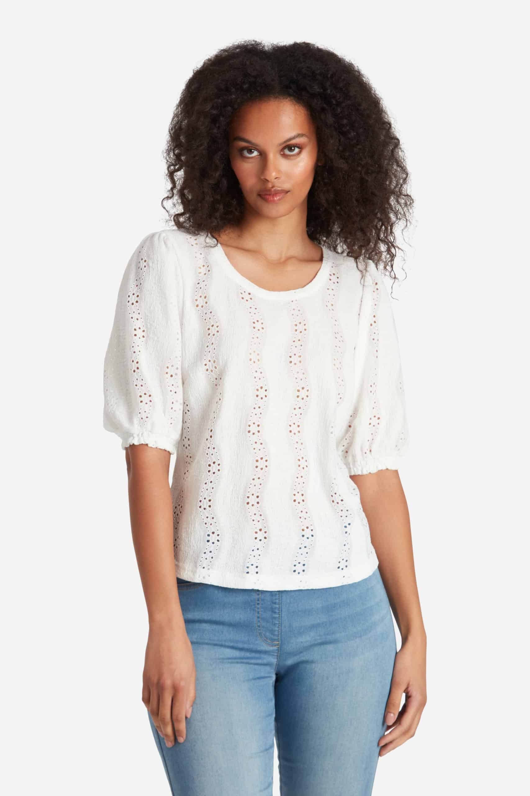 Ny toppmodell med hålmönster i en lätt trikå kvalitet. Den mellankorta ärmen ger viss puff effekt och avslutas med en liten resårkant med frill. Toppen har rund halsringning med ett kantband i samma tyg som grundtyget, och passformen är något insvängd i midjan. Den totala längden i storlek S är 59 cm från den högsta punkten.