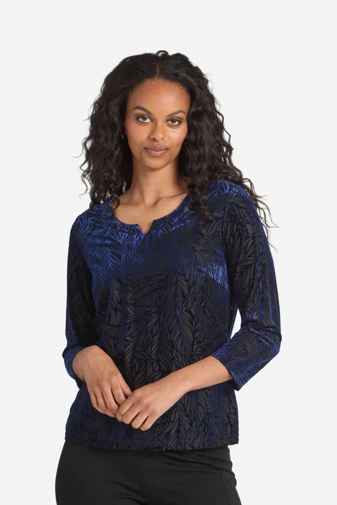 Vacker sammetstopp med burnout effekt och diffust mönster i svart och blått. Rund hals med litet V-sprund i mitten och 7/8-dels ärm. Modellen är något insvängd i midjan och den totala längden i storlek S är 61 cm från den högsta punkten. Modellen på bilden är 178 cm lång.