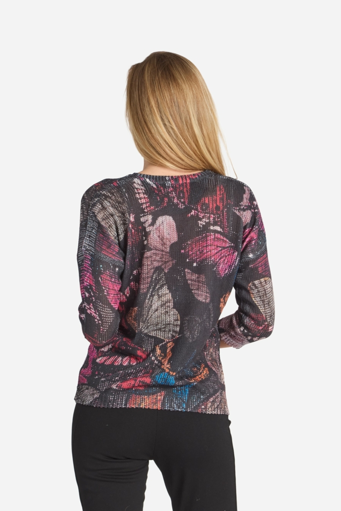 Läcker topp i stickad modell med stormönstrat print både fram och bak. Toppen är rak i modellen och faller lätt mot kroppen. Rund halsringning med ribbstickad kant, som även finns i änden på den 3/4-långa ärmen och nertill på plagget. Den totala längden i storlek S är 60 cm från högsta punkten.
