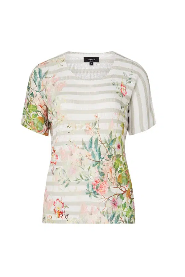 Vårig topp i stickad modell med rand- och blomprint både fram och bak. Toppen är rak i modellen och faller lätt mot kroppen. V-formad halsringning med ribbstickad kant, som även finns i änden på korta holkärmen och nertill på plagget. Den totala längden i storlek S är 60 cm från högsta punkten.