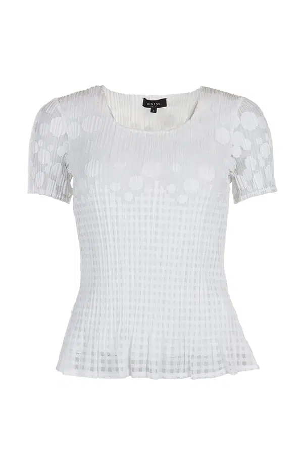 Plisserad och genombruten topp som är fodrad med ett linne i offwhite. Rund halsringning och kort ärm. Modellen är något insvängd i midjan med ett lite vidare avslut runt höften. Denna kan med fördel matchas med Kjol Nisa Li i samma serie.