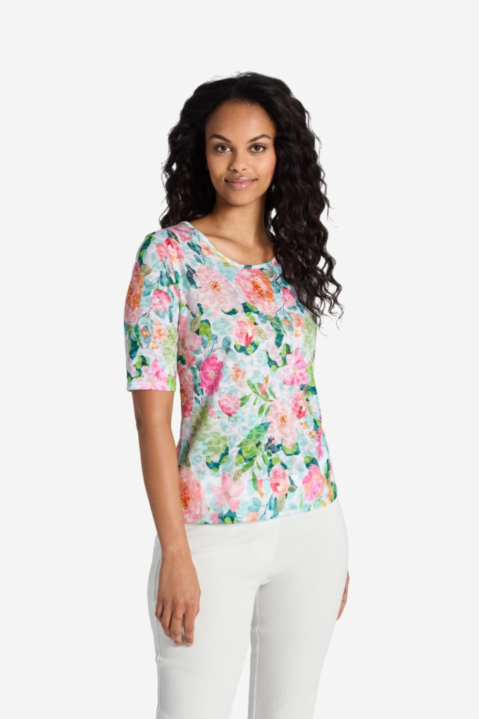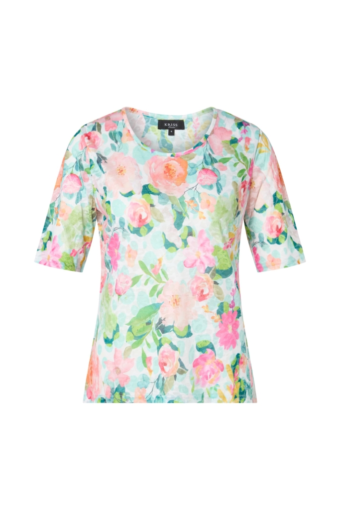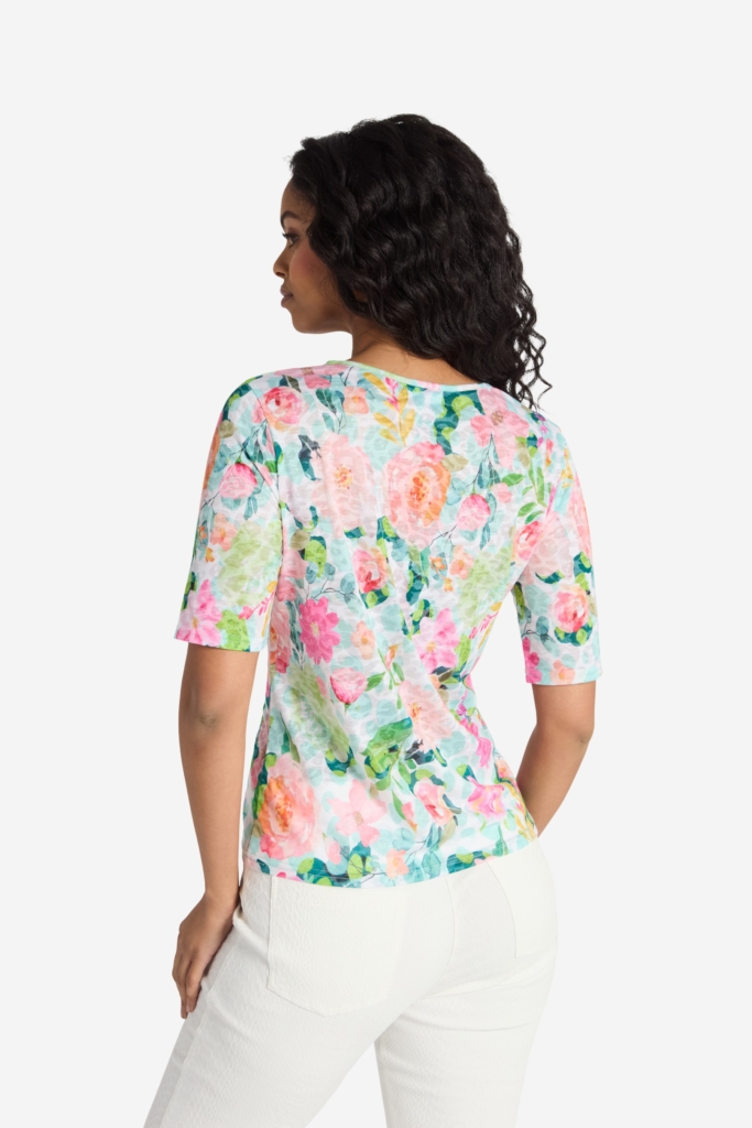 En mjuk och tunn topp med blommigt print i burnout trikå. Modellen är relativt rak i passformen och den korta ärmen går en bra bit ner på överarmen. Den runda halsringningen har en dekorativ kant påsydd i samma tyg. Den totala längden i storlek S är 61 cm från den högsta punkten.