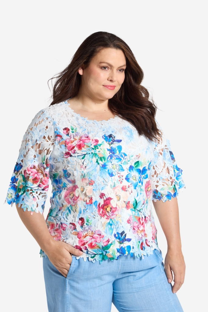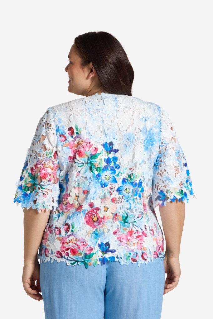 Vacker spetstopp med printade blommor på en vit botten. Rund hals med en blombård och något längre kort ärm. Toppen är fodrad fram och bak, och har ojämn nederkant på både body och ärm efter spetsens mönster. Den totala längden i storlek S är 62 cm från den högsta punkten. Modellen på bilden är 178 cm lång och bär storlek small. Våra större storlekar är normala i storleken, medan våra mindre storlekar är något mer generösa.