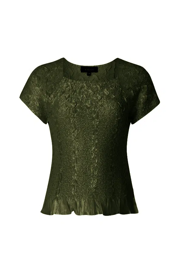 En favorit med klädsam fyrkantsringning vid halsen och en liten holkärm som täcker axeln. Toppen är krinklad på olika sätt och utstruken i nederkanten, och den har en sidenmjuk och glansig kvalitet som är lätt att sköta. Matchar fint under kavaj/jacka eller att använda precis som den är. Enkel men med en exklusiv känsla. Den totala längden i storlek S/M är 56 cm från den högsta punkten.