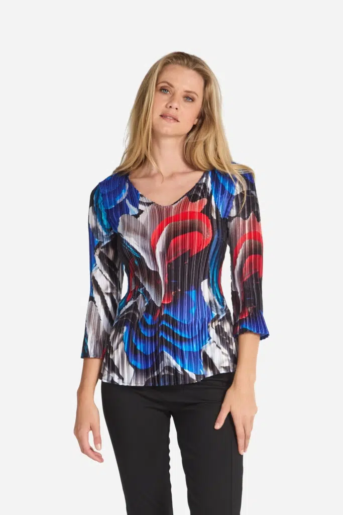 Plisserad topp med stormönstrat print i härliga färger. Modellen är blank och smidig i tyget och har en mjuk V-formad halsringning framtill. Den har 3/4-lång ärm och är något insvängd i midjan. Den totala längden i storlek S är 62 cm från den högsta punkten. Toppen är snygg att ha under en kavaj eller att bära precis som den är.