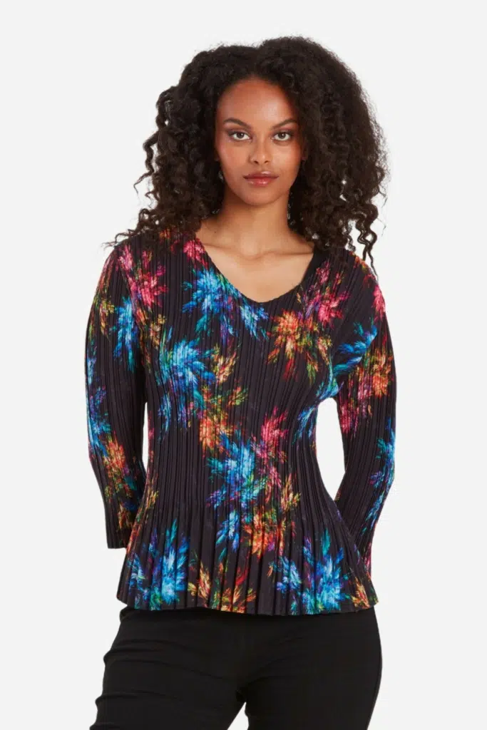 Plisserad topp med färgglatt print på en svart botten. Modellen är matt och smidig i tyget och har en mjuk V-formad halsringning framtill. Den har 3/4-lång ärm och är något insvängd i midjan. Den totala längden i storlek S är 62 cm från den högsta punkten. Toppen är snygg att ha under en kavaj eller att bära precis som den är.