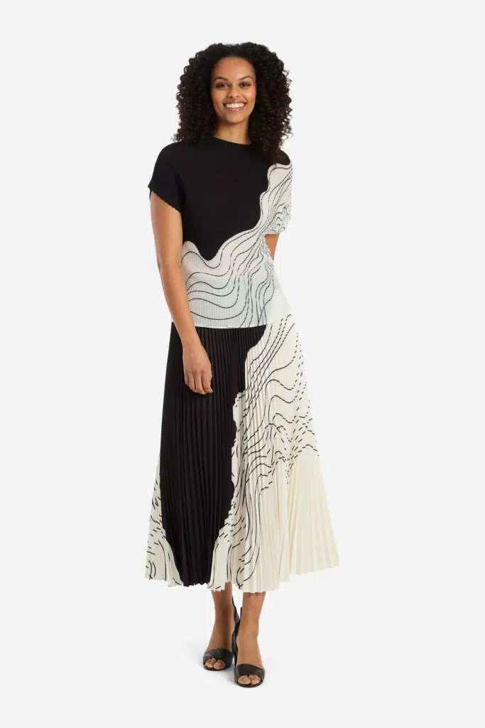 Plisserad topp med kontrastfärgat print i vitt och svart med hög halsringning. Kort holkärm som täcker axeln. Den totala längden i storlek S/M är 48 cm från den högsta punkten. Passar utmärkt ihop med Kjol Tam i samma serie.