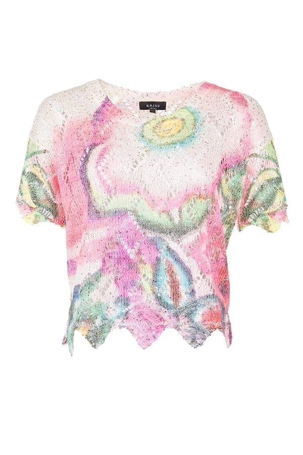 Fantastifull tröja i pastellfärger som har små paljetter i guld vilket ger ett exklusivt intryck. Stickad med genombrutna diagonalrutor och asymmetriska linjer i tröjans nederkant, samt vid den korta ärmens avslut.