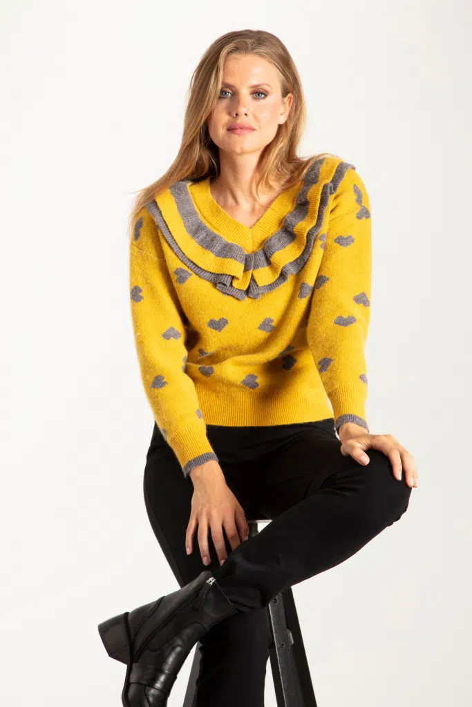 Härlig stickad tröja i senap med hjärtan och grå detaljer. V-formad halsringning med en ribbstickad kant samt en randig volang i dubbla lager. Modellen är rak i passformen och har en ribbstickad kant nedtill, vilken även finns i nederkant av den långa ärmen, där den avslutas med en grå kant. Den totala längden i storlek S är 59 cm från den högsta punkten under halskanten.