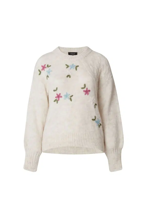 Söt stickad tröja i melerat garn med flerfärgade blombroderier och dekorationspärlor. Rund halsringning med ribbad halskant som även finns i ärmslutet på den långa ärmen samt vid nederkanten av plagget. Tröjan har olika sticksätt, nedhasad axelsöm och rak passform . Den totala längden i storlek S är 55 cm från den högsta punkten.