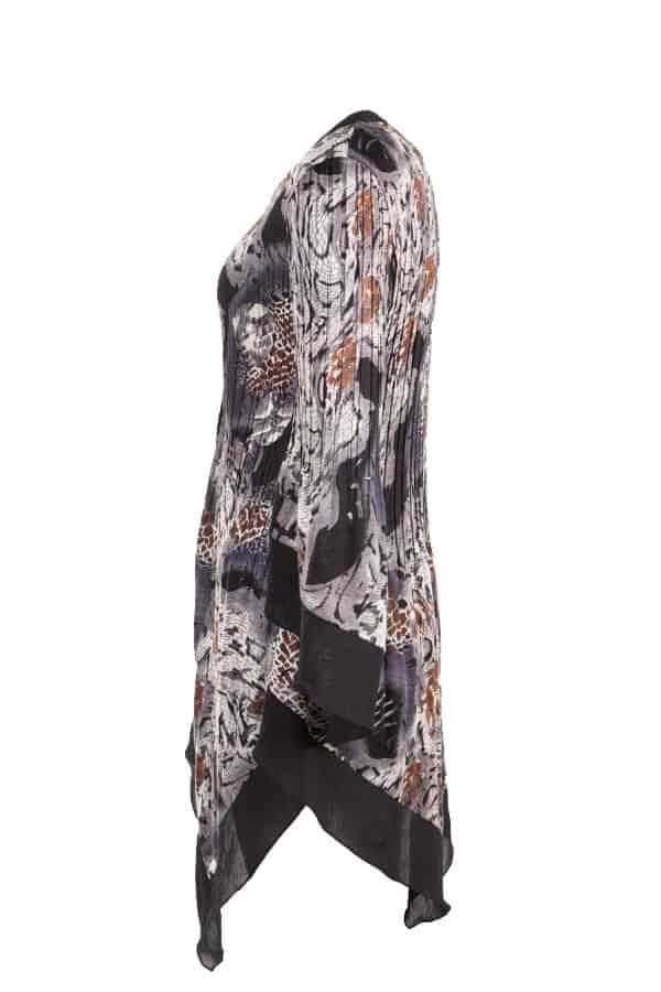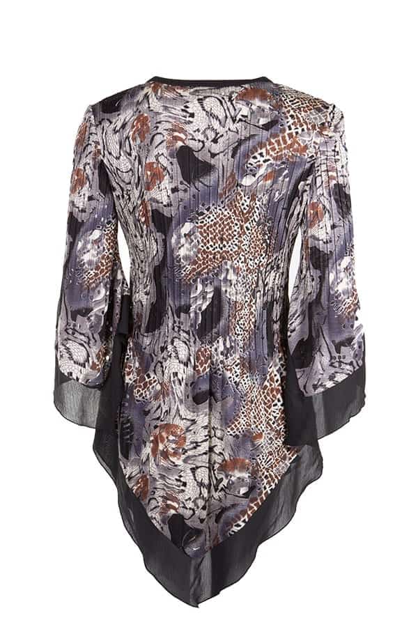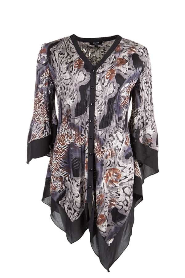 Klassisk KRISS tunika i ett mjukt jersey material av stretchig burnout. Spännande print med inslag av snake i färgerna svart/stone/brun. Tunikan har en lätt krinkling med fint fall och asymmetri i nederkanten vilket ger ett slankande och förlängande intryck. Skirt avslut med svart chiffongkant i tunikans flikiga ärmslut och nederkant. Matchande svart kant runt den v-ringade halsringningen som löper ner längs knappslån. Genomknäppt modell med små svarta knappar.