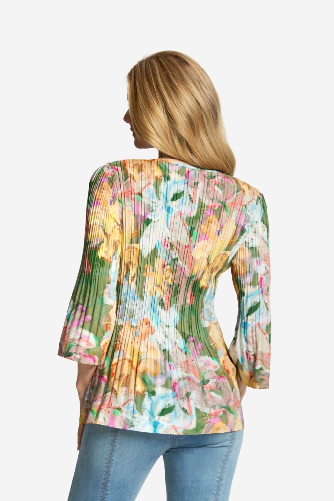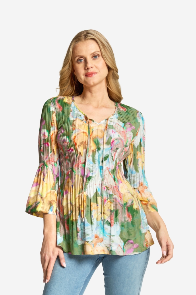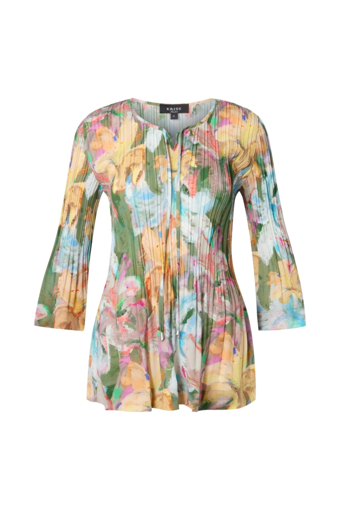 Plisserad tunika i skön kvalitet med storblommigt print. Tunikan har en högt skuren rund halslinje med ett kantband som går över i två knytband mitt fram. Dessa avslutas med en silverfärgad detalj i vardera ände. 3/4-lång ärm med utstruken kant nedtill. Plisseringen släpper i tunikans nederkant, och den faller snyggt över stussen. Den totala längden i storlek S är 72,5 cm från den högsta punkten. Modellen på bilden är 178 cm lång och bär storlek small. Våra större storlekar är normala i storleken, medan våra mindre storlekar är något mer generösa.