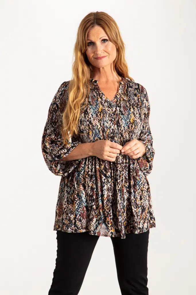 Tuff tunika med flerfärgat snake print och skön känsla. Plisserad kvalitet med en tätare plissering runt byst och liv och en lättare plissering nertill vilket ger tunikan ett snyggt fall runt stussen. Lång ärm med ett plisserat parti på överärmen och en knappslejf som formar och lyfter ärmen med ett knäpp. Ståkrage med klädsam V-ringning. Modellen är genomknäppt med svarta knappar. Den totala längden i storlek S är 78 cm från den högsta punken.