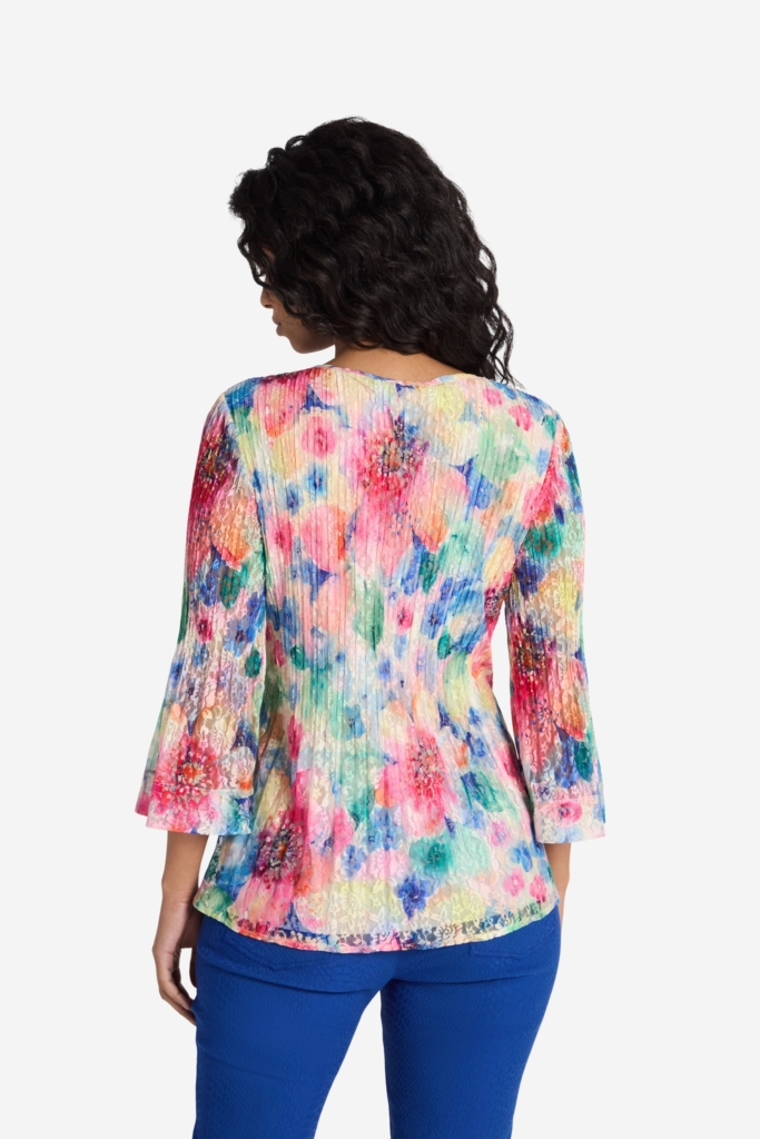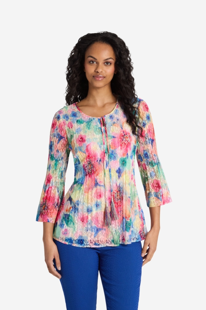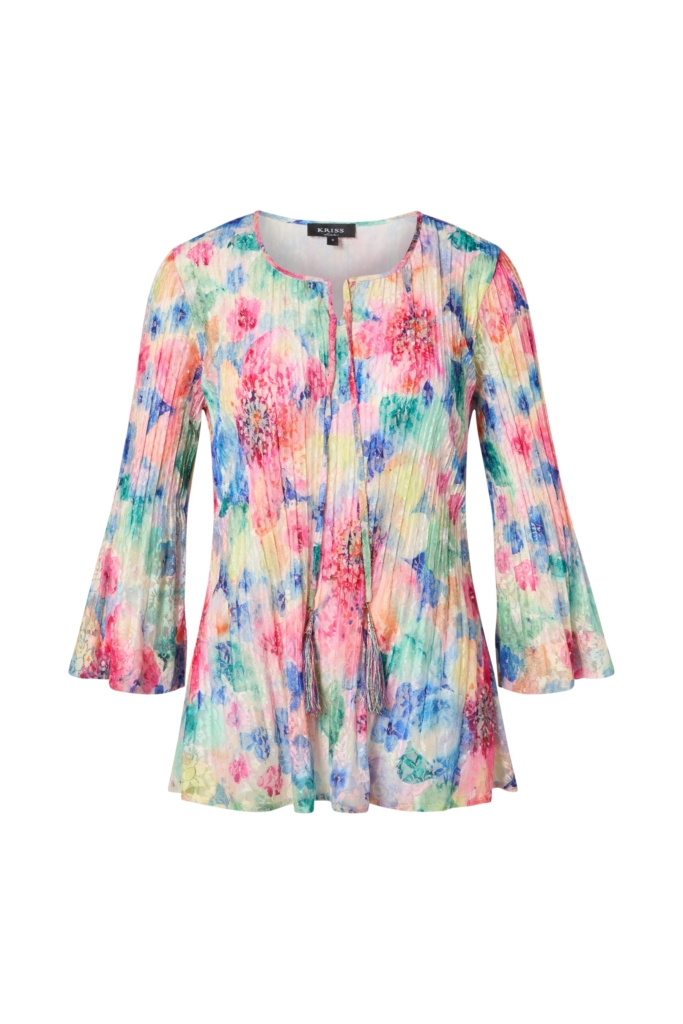 Plisserad tunika i printat spetstyg som är fodrad med mesh foder. Tunikan har en högt skuren rund halslinje med ett kantband som går över i två knytband mitt fram. Dessa avslutas med en silverfärgad detalj samt en tofs i vardera ände. 3/4-lång ärm med vidd nedtill. Plisseringen släpper i tunikans nederkant vilket gör att den faller snyggt över stussen. Den totala längden i storlek S är 70 cm från den högsta punkten. Modellen på bilden är 178 cm lång och bär storlek small. Våra större storlekar är normala i storleken, medan våra mindre storlekar är något mer generösa.