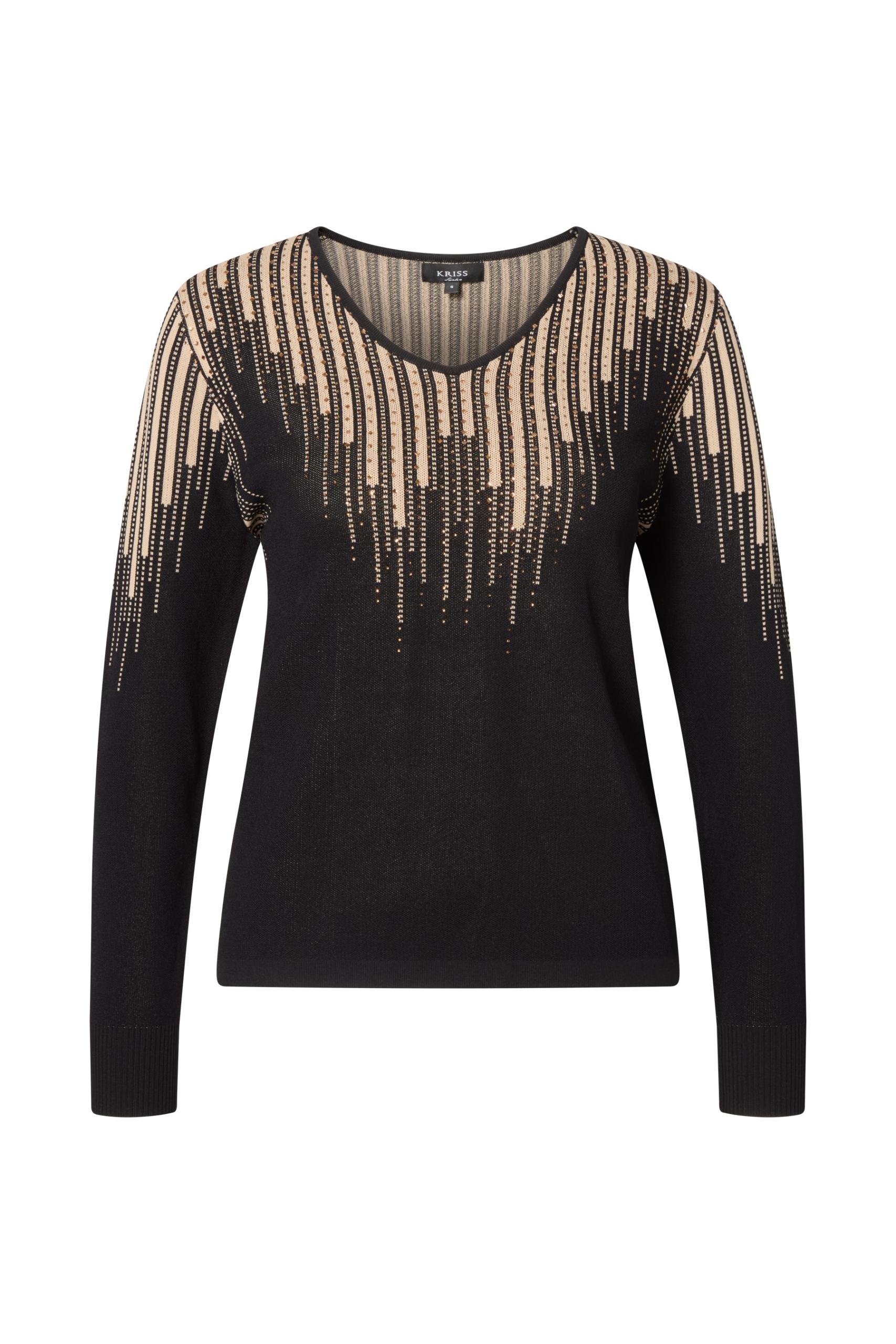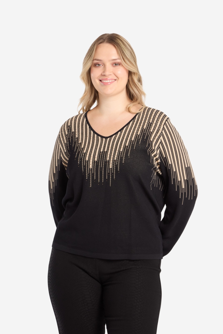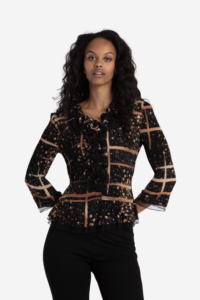 Plisserad tunika i printat spetstyg som är fodrad med ett mesh foder. Tunikan har en högt skuren rund halslinje med ett kantband som går över i två knytband mitt fram. Dessa avslutas med en guldfärgad detalj samt en tofs i vardera ände. 3/4-lång ärm med vidd nedtill. Plisseringen släpper i tunikans nederkant vilket gör att den faller snyggt över stussen. Den totala längden i storlek S är 70 cm från den högsta punkten. Våra större storlekar är normala i storleken, medan våra mindre storlekar är något mer generösa.