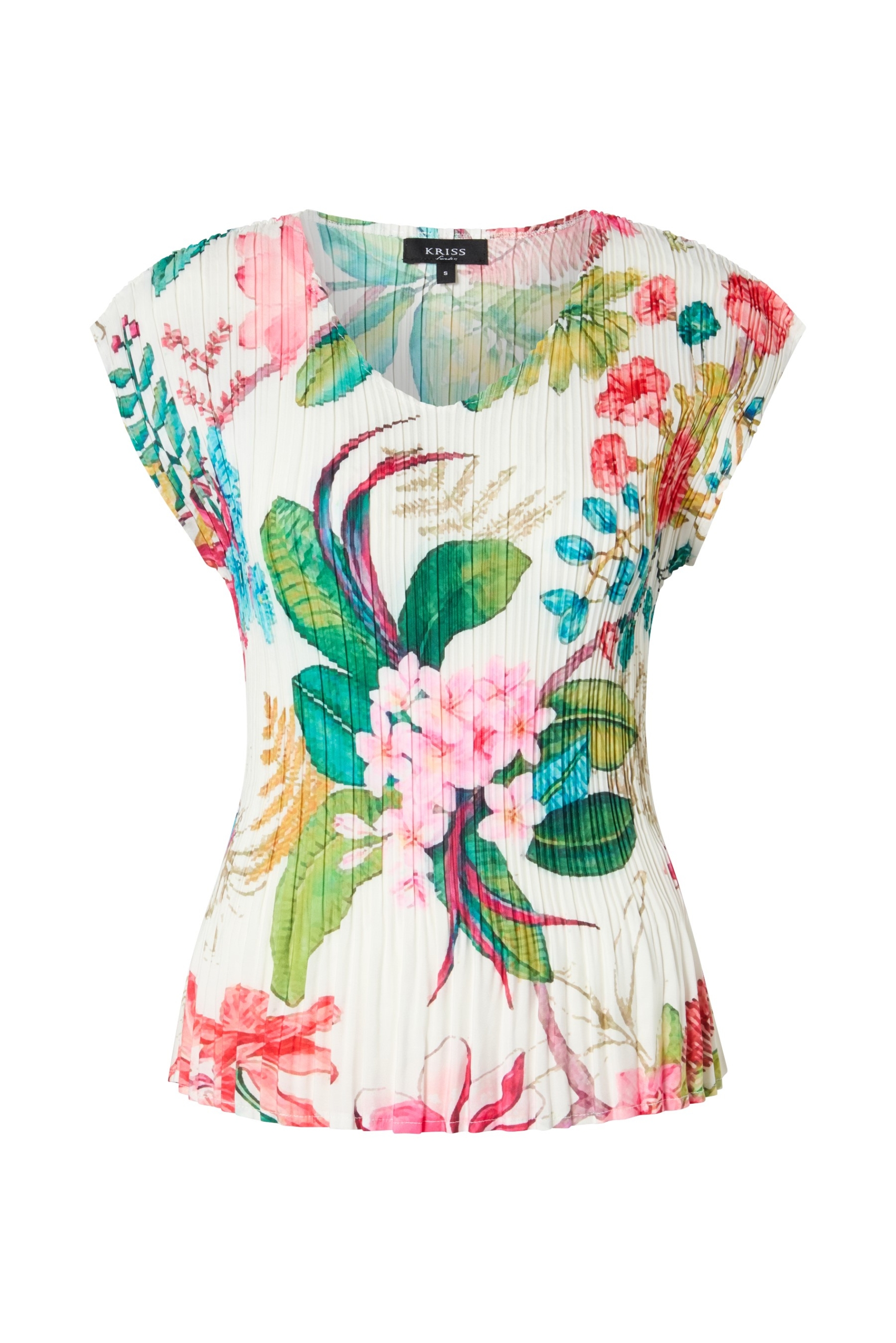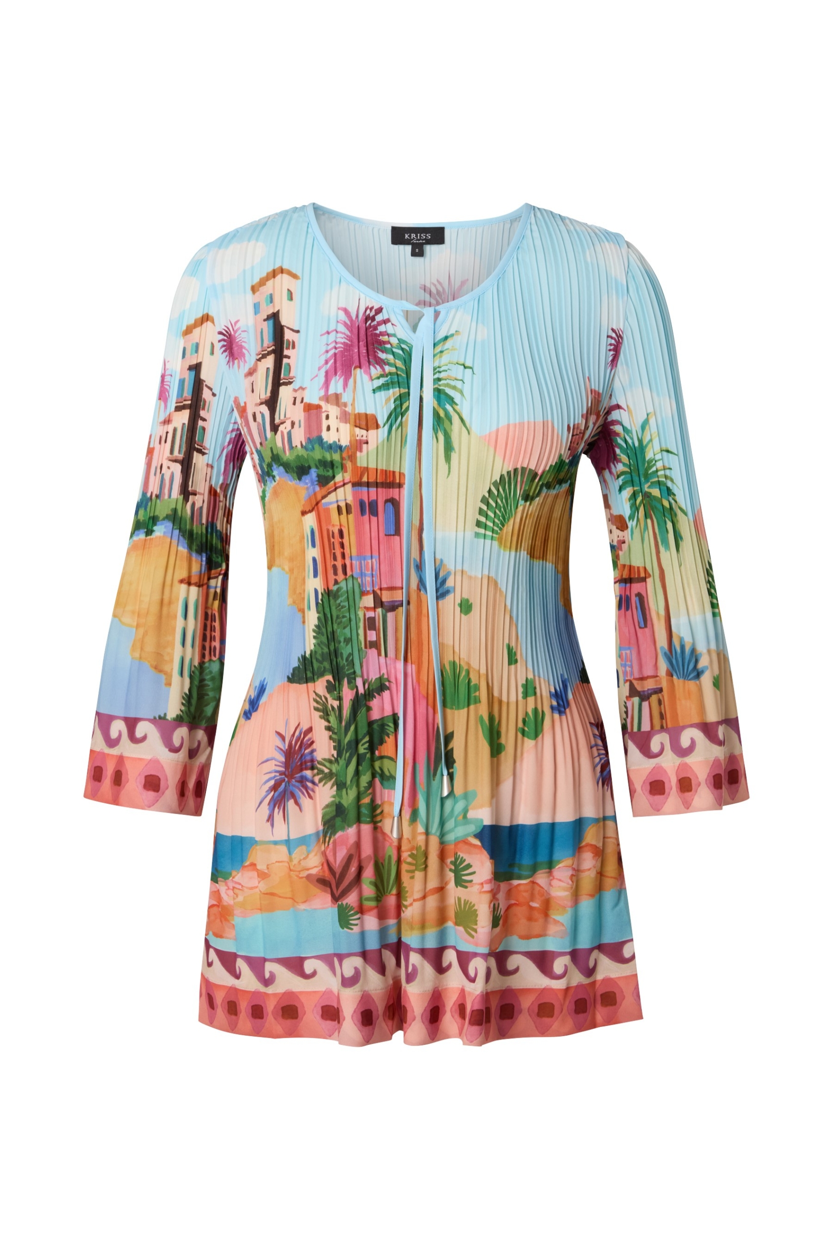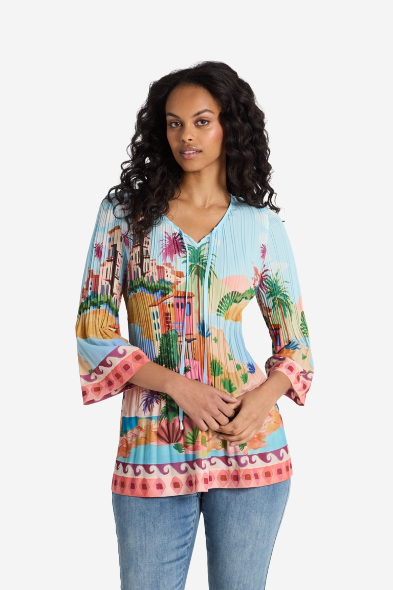 Vårlig tunika med placerat print i vackert utförande. Plisserad kvalitet med en tätare plissering runt byst och liv och en lättare plissering nertill. Lång ärm med ett plisserat parti på överärmen och en knappslejf som formar och lyfter ärmen med ett knäpp. Ståkrage med klädsam V-ringning, och stängning med dekorativa knappar. Den totala längden i storlek S är 76,5 cm från den högsta punkten. Modellen på bilden är 178 cm lång.